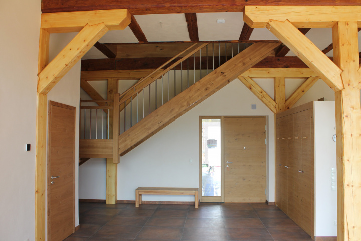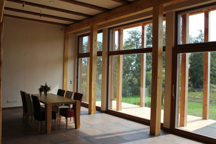 Um den Ansprüchen des Denkmalschutzes und des avisierten hohen Energiestandards gerecht zu werden, wurde ein Haus-in-Haus-Konzept in ökologischer Bauweise gewählt. Die Kubatur der Scheune ist größer als die thermische Hüllfläche des beheizten Wohnbereiches. Lediglich an der Südseite der Wohnbereich direkt an die Außenwand wurde die Fassade großflächig eröffnet und mit Glasflächen versehen, um die passive Solarenergie zu nutzen. Ein vorgelagerter Balkon sichert in den Sommermonaten die Verschattung und ermöglicht gleichzeitig im Winter der tief stehenden Sonne bis weit in die Wohnräume zu scheinen. Der hohe Dämmstandard in Kombination mit einer hohen Luftdichtheit des Innenhauses gewährleistet einen sehr geringen Restwärmebedarf, der mit erneuerbaren Energien gedeckt wird. An der Nordseite (Hofansicht) und Teilflächen der Südseite wurde das historische Fachwerk denkmalgerecht rekonstruiert.