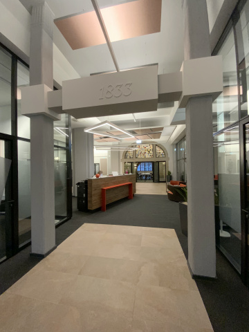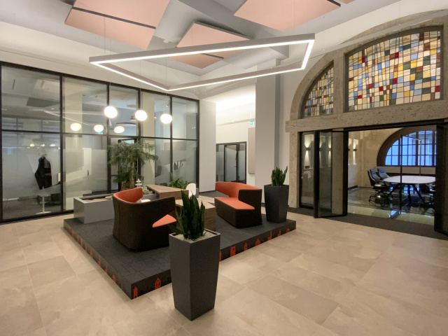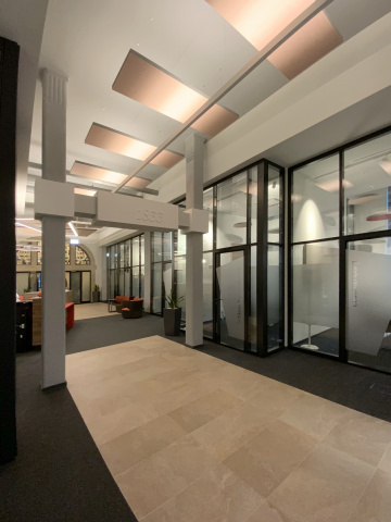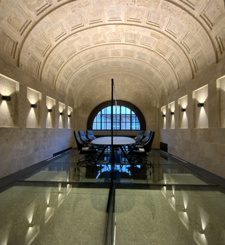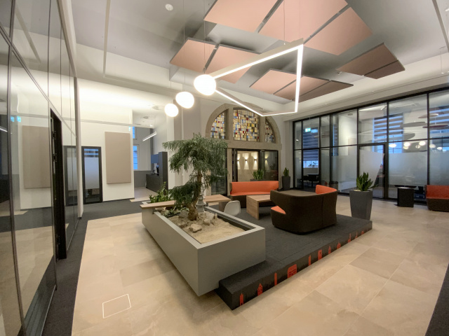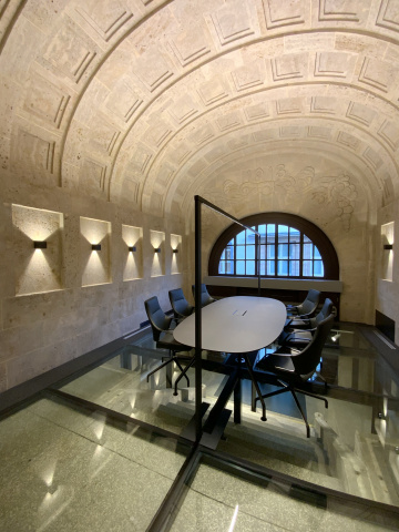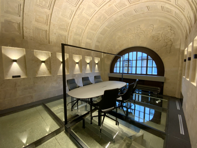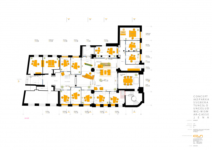 Das Hauptgebäude der Sparkasse Jena befindet sich in der historischen Stadtmitte von Jena. Das Gebäude wurde 1913 errichtet. Das Erdgeschoss beherbergte viele Jahrzehnte die historische Kassenhalle die über ein sehr elegantes Portal an der Ludwig-Weimar-Gasse erschlossen wurde. Dieser Bereich wurde in den 90er Jahren des vergangenen Jahrhunderts stark überformt und der Hallencharakter wurde damit völlig aufgehoben. Die Sparkasse beabsichtigte die ehemalige Kassenhalle im neuen Kontext als Beratungszone wieder zu beleben. Entwurfsziel war zehn attraktive und zeitgemäsze Kundenberaterplätze, einen Vorbereitungsraum und einen Meetingbereich zu schaffen. Darüber hinaus war der Wunsch nach einer Empfangszone und der Möglichkeit zur Nutzung für Veranstaltungen im kleinen Rahmen entwurfsbestimmend. Durch die sich in den letzten Jahrzehnten neu etablierte Zugangssituation über das City Carree war der traditionelle Haupteingang obsolet. Die Qualitäten des Raumes waren offensichtlich und so entschieden wir uns mit der Sparkasse diesen Raum zu adaptieren und verwandelten ihn in einen Meetingraum. Durch den Glasboden kann heute noch der historische Eingangsbereich nachvollzogen werden, der neu entstandene Raum unter der Beratungszone wird künftig als Vitrine in Richtung Ludwig-Weimar-Gasse genutzt. Durch den Einsatz von hochschalldämmenden Glaswänden wurden die Beraterräume von der öffentlichen Fläche entkoppelt, dabei wurden die historischen Proportionen wieder belebt und sichtbar gemacht. Im Bereich der ehemaligen Vorhalle wurde ein öffentlicher Bereich geschaffen, der sich dem Thema Warten, Aufenthalt und Veranstaltung widmet. Den Abschluss dieses Areals definiert eine Pflanzanlage mit Zengarten sowie ein Flügel. Dieser zentrale Punkt wurde als Podest abgebildet und organisiert die Kundenströme zwischen Beratung und Schlieszfachanlage.