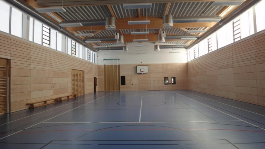 Die 70er-Jahre-Sporthalle befand sich noch im Originalzustand und wurde mit dem Ziel einer Mehrzwecknutzung für Sport und kulturelle Veranstaltungen mit den dafür notwendigen Standards in Bezug auf Funktion, Ausstattung, Brandschutz und Energieeffizienz saniert. Die Räume wurden funktionell neu geordnet, ein zusätzlicher Trainingsraum geschaffen und der Eingangsbereich neu gestaltet. Dazu war das Objekt komplett zu entkernen. Halle und Kegelbahn erhielten aus Brandschutzgründen ein neues Dach in Brettschichtholz-Konstruktion. Der Hallenraum wurde mit Prallwänden aus Schichtholz-Beplankung und einem neuen Sportfußboden ausgestattet. Für die blendungsfreie Belichtung bis zur Hallenmitte wurden Fenster mit lichtstreuender Verglasung eingesetzt. Die energetischen und raumklimatischen Anforderungen werden zukünftig durch die umfassend ausgeführte Wärmedämmung, den Einsatz einer Wärmepumpe mit Fußbodenheizung sowie einer Lüftungsanlage gewährleistet. Das Gebäude wird geprägt durch die Vorhangfassade aus großformatigen Fassadentafeln.