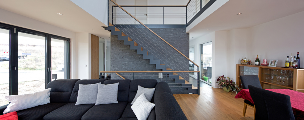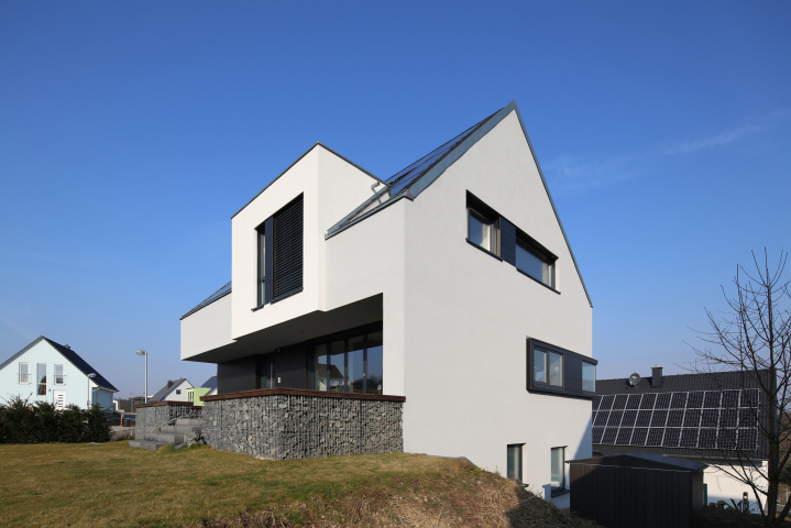 Ziel war es eine freie Form als Antwort auf die größten Teils monotone Architektur der Marbacher Baugebiete zu finden. Die Funktionen im Inneren abgestimmt auf die Bedürfnisse der Eigentümer vereint mit den Möglichkeiten der örtlichen Lage prägten dabei die Grundideen. Dabei war es vor allem der fantastische Stadtblick der immer wieder inszeniert wurde um den Räumlichkeiten so eine besondere Qualität zu geben. Nachteilige Grundstücksituationen wurden zum Vorteil gekehrt und so Sonderlösungen wie die seitliche Garageneinfahrt in das Haus oder die auskragenden Freisitze mit Stadtblick und Abendsonne entwickelt. Die leichte Hanglage lies eine zweigeteilte Erschließung der Hauptwohnung und der Einliegerwohnung zu. Der Wohnbereich im Erdgeschoss wurde offen und großzügig gestaltet. Dabei ist zentrales Element die in der Galerie freistehende Treppe. Durch die Deckenöffnung entstand ein Luftraum bis unter die Dachspitze. Der Erdgeschossbereich lässt sich durch die 5 Meter breite Falt-Fenster-Anlage in den Außenbereich erweitern. Über die Galerie erreicht man die Schlafzimmer im Obergeschoss. Durch eine Innenraumplanung wurde das Wohnkonzept perfekt auf die Anforderungen der Nutzer abgestimmt. Funktionsbereiche wie Bäder individuell gestaltet und Einbaumöbel entworfen. Materialien wurden auf einzelne immer wiederkehrende Themen reduziert. Um einen möglichst niedrigen Energiebedarf zu erreichen wurde die Gebäudehülle optimal gedämmt. Abgerundet wurde das Energiekonzept durch Wärmepumpe und Lüftungsanlage mit Wärmerückgewinnung. Um den Strombedarf der Wärmepumpe zum Teil selbst abzudecken wurde eine Photovoltaikanlage in die Süd-Dachfläche integriert.