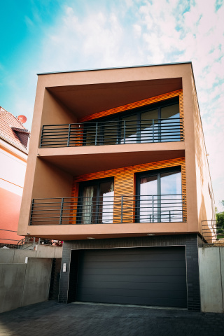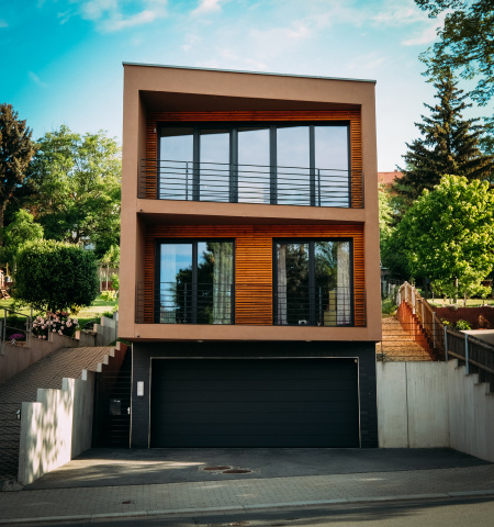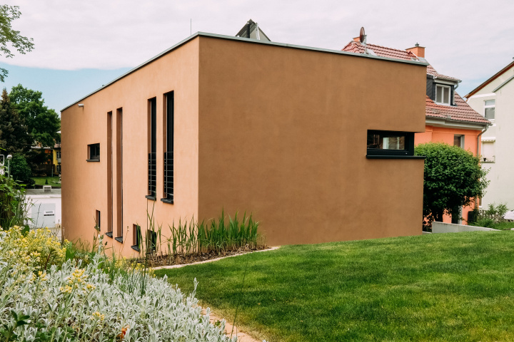 Unter Einhaltung einer offenen Bauweise ergab sich eine Bebauung mit einer maximalen Breite von knapp 6m. Errichtet werden sollte ein Einfamilienhaus für eine vierköpfige Familie mit integrierter Garage. Straßenseitig wirkt das Gebäude als dreigeschossiger Baukörper. Gartenseitig ist dieser aufgrund der Hanglage nur noch als eingeschossiger Baukörper wahrnehmbar.