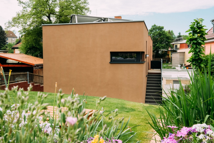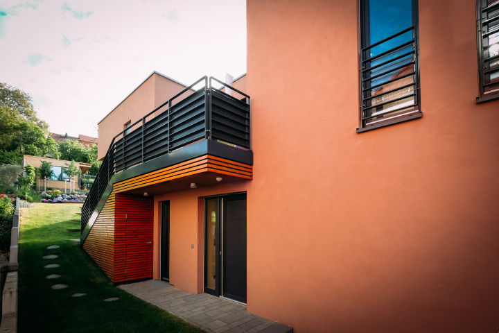 Das Erd- und das Obergeschoss beherbergen die Wohnräume, wobei das Obergeschoss die zentralen Wohnnutzungen beinhaltet. Angeordnet sind hier der großzügige Wohn- und Essbereich mit Südausrichtung, der Kochbereich, ein Badezimmer sowie das Schlafzimmer. Weiterhin ist im Obergeschoss eine Loggia als Dachterrasse über dem Eingangsbereich im Erdgeschoss als Freisitz vorhanden. Von der Dachterrasse führt eine Außentreppe direkt in den Garten und stellt somit die zentrale Verbindung zwischen Wohnhaus und Garten her. Im Erdgeschoss sind zwei gleichgroße Kinderzimmer angeordnet, ein WC mit Duschbereich, ein Arbeitszimmer (hangseitig) sowie ein kleiner Abstellraum für Putzmittel. Dem Nutzer lag ein besonderes Interesse daran, die Wohnnutzungen in Haupt- und Nebenwohnnutzungen zu trennen. So besteht die Möglichkeit, wenn keine Kinderzimmer im Haus mehr benötigt werden, diese als Arbeitsbereich- und Etage unabhängig der übrigen Wohnbereiche umzunutzen.