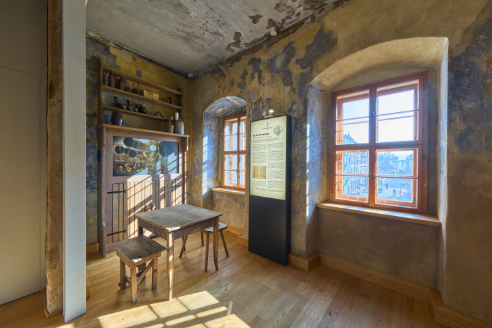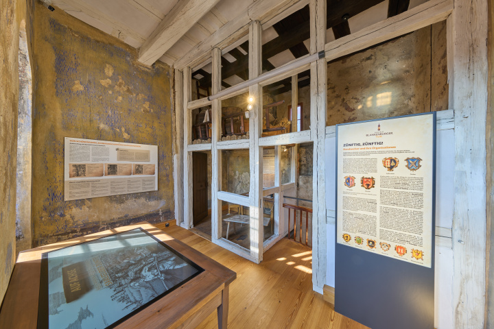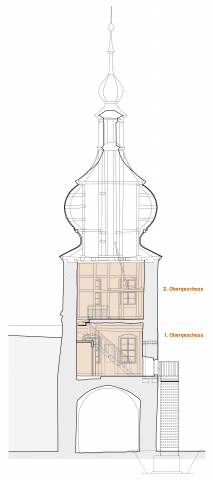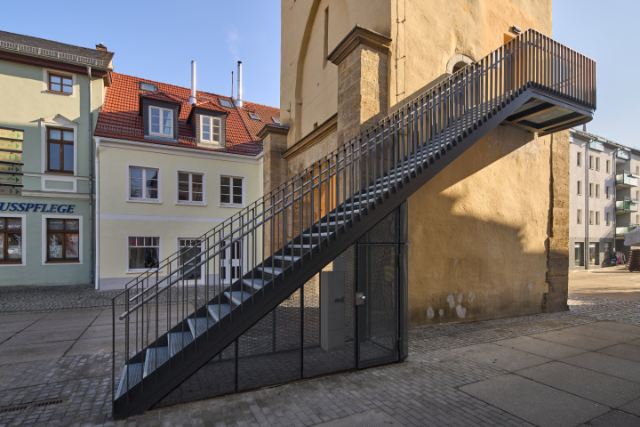Eine moderne, außen liegende Treppe erschließt die zwei übereinander angeordneten Ausstellungsräume. Die neue Türöffnung im 1. OG des ca. 1,20 m starken Turmmauerwerk musste statisch die Wirkung des Mauerspannankers ausgleichen. Im Innenbereich wurden die Spuren der Jahrhunderte belassen und mit Ausstellungsobjekten, kleinen Medieninstallationen und Mitmach-Stationen ergänzt.