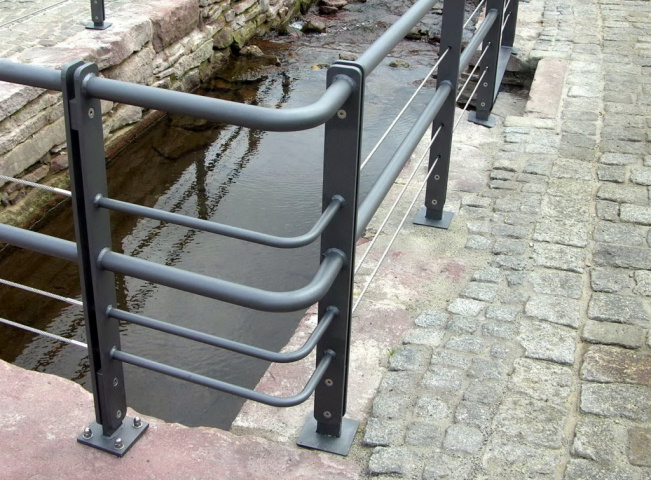Da der Bach bei Gewitter erhebliche Mengen Holz, Laub usw. mitführt, wurden 3 Reinigungsgitter angeordnet und das Straßenprofil V-förmig ausgebildet. Somit fließt der Bach auch bei Überflutung zurück ins Bachbett.