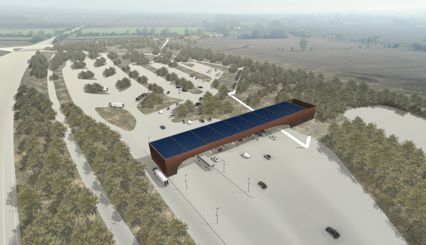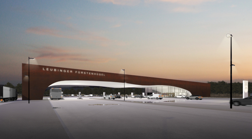 Die Anlage wird als kompakter Riegel vorgesehen, der sowohl das Tanken als auch Shop, Bistro und Restaurant unter einem Dach vereint. Dabei geht die Form auf die Besonderheit des Ortes ein und macht den Besucher neugierig. Aus dem langgestreckten, orthogonalen Riegel wird die einzigartige Silhouette des Fürstenhügels subtrahiert.
