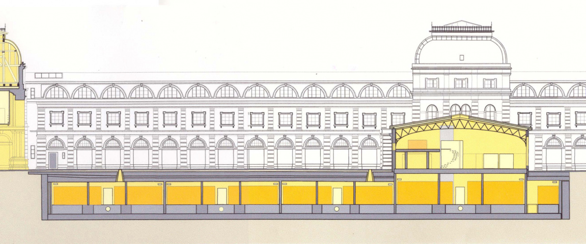 Durch den Neubau des Tiefmagazins wurde auf der Kellerebene des Hofes für Aktenverkehr und Personal eine innerbetriebliche, niveaugleiche Verbindung der äußeren Umfassungsbauten hergestellt. Vertikale Erschließungskerne verbinden das Tiefmagazin mit der Blockrandbebauung, dem Bürotrakt der Archivare, den Werkstätten und dem Lesesaal. Es besteht aus fünf, in Nord-Süd-Richtung addierten Magazinkammern, flankiert von seitlichen Erschließungsfluren, die auch die wiedererrichtete Reithalle(Lesesaal) unterfahren.