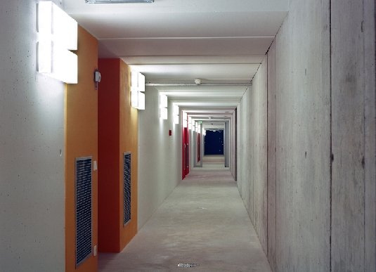 Dem Konzept des vorbeugenden baulichen Brandschutzes wurde damit der Vorzug gegeben, auf automatische Löschtechnik konnte vollständig verzichtet werden. Überschnittene Bohrpfahlwände mit Rückverankerung sichern einen verformungsarmen Baugrubenverbau und verhindern Grundwasserabsenkungen des Umfeldes. Die als Weiße Wanne ausgebildete Stahlbetonkonstruktion erhält Auftriebssicherheit über eine Magerbetonballastierung. Sichtbetonflächen dominieren die farbig klassifizierten Magazinkammern und ragen über Aufzugsschächte und Treppenhäuser bis in die Erdgeschossebene.