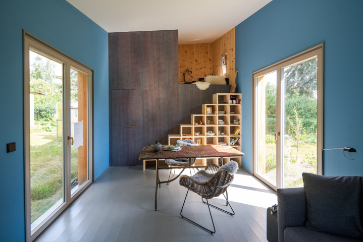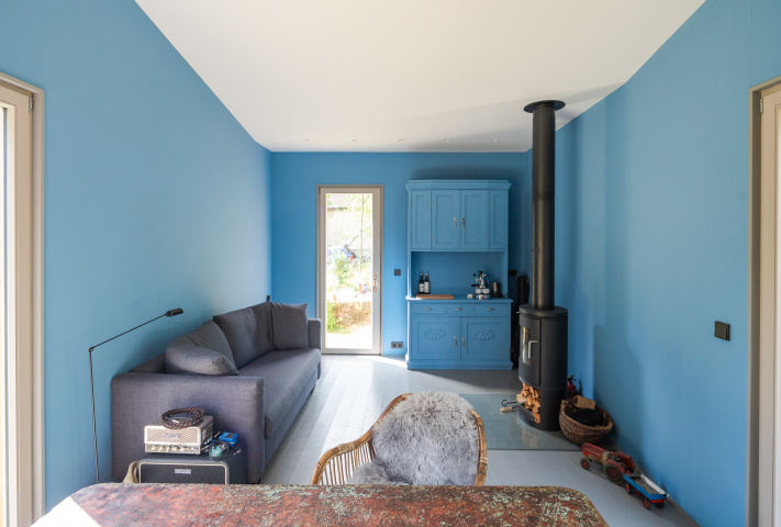 Fenster nach drei Seiten holen die Natur ins Innere. Hier lassen sich alle Jahreszeiten und Wetter erleben. Im Winter prasselt ein Holzfeuer im Kamin. Die intensive blaue Wandfarbe schafft einen akzentvollen Hintergrund für moderne und historische Möbel. Aus einem im Gebrauchtmarkt billig erworbenen Holzschrank wurde via Upcycling durch kleine Anpassungen vom Schreiner und die Farbfassung im Wandton das perfekt ins Haus passende Küchenmöbel. Feste Einbauten wie das Treppenregal vereinen multiple Nutzungen in einem Möbelstück. Die hochdämmende, atmungsaktive Holzkonstruktion und ein Holzkamin machen das Haus rund ums Jahr als kleines Refugium nutzbar.