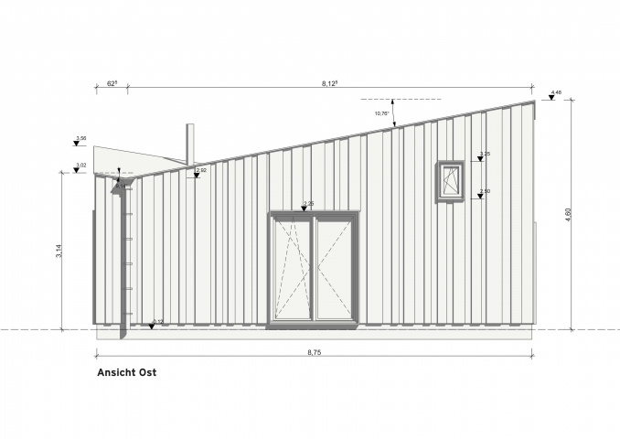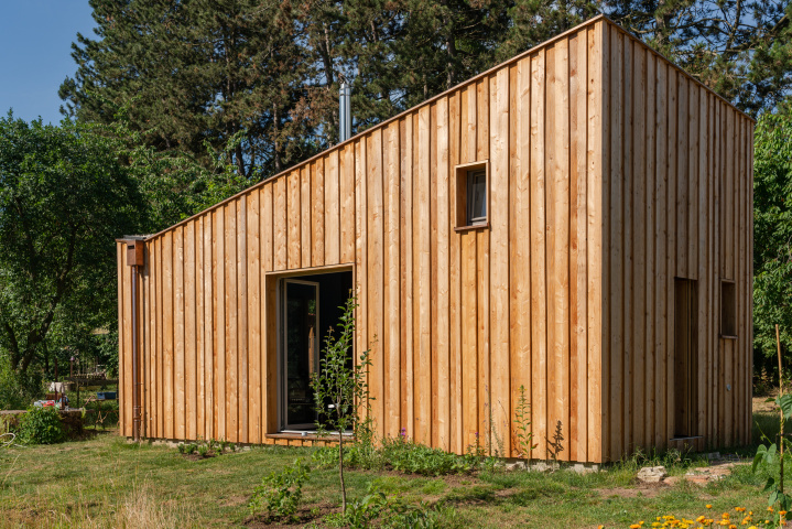 Der Neubau ersetzt eine baufällige DDR-Typendatsche. Holz wird als wesentlicher Baustoff schon in der Fassadenverkleidung erkennbar, welche nach und nach eine Patina entwickelt. Das Schmetterlingsdach mit versetzt liegender Kehle prägt die Gebäudeform, so dass das Haus von jeder Seite aus anders wirkt. Zu den Nachbarn schmal, breitet es sich zum eigenen Garten mit einer großzügigen Geste aus. Die kantige Geometrie spielt mit Schrägen und Höhen, welche im Inneren geschickt für die Raumaufteilung genutzt werden. So entstehen auf 27 m² Nettogrundfläche ein Wohn-Essbereich und eine Schlafempore. Zwei Nebenräume „verschwinden“ diskret dienend im Hintergrund. Die eingebaute ökologische Trenntoilette funktioniert ohne Wasser.