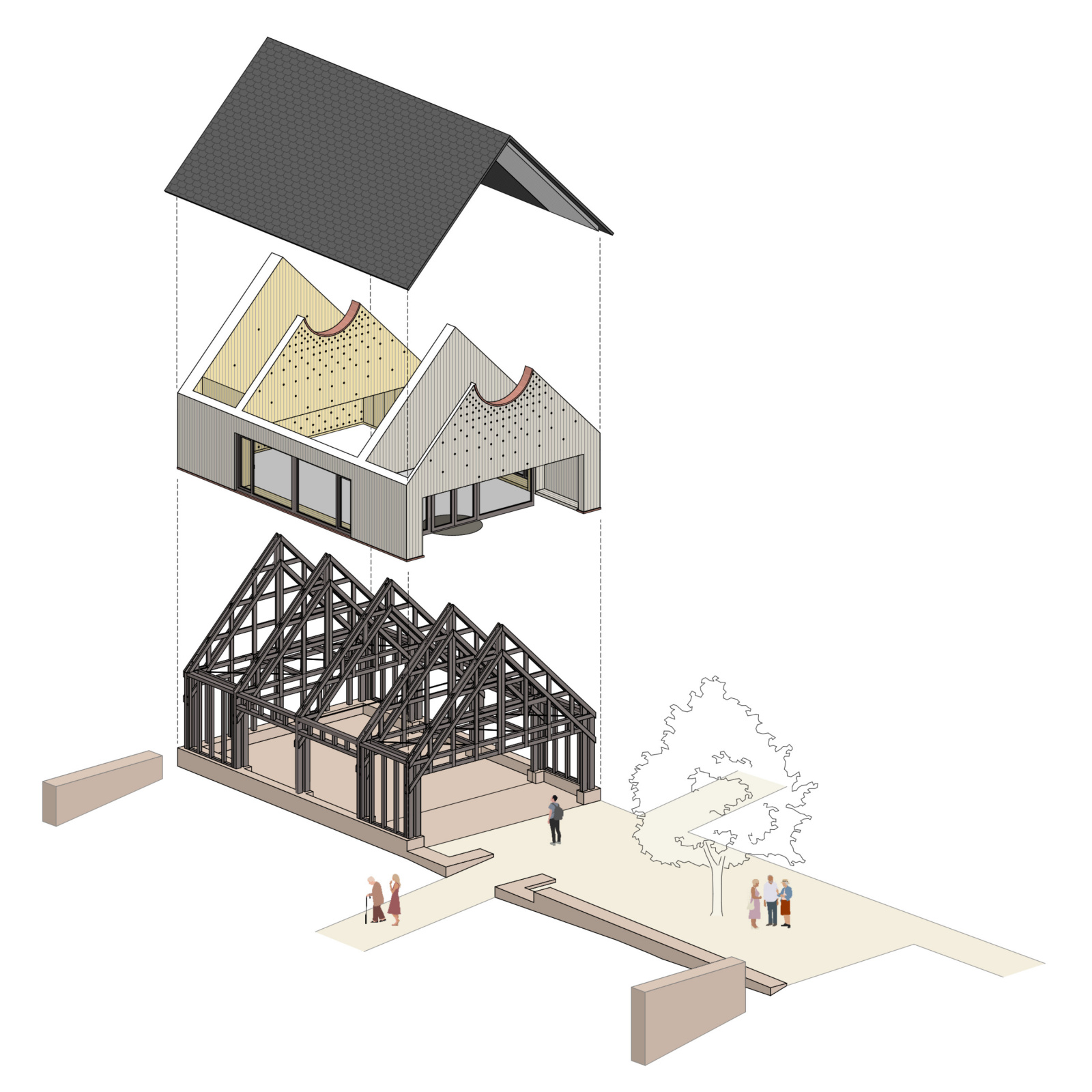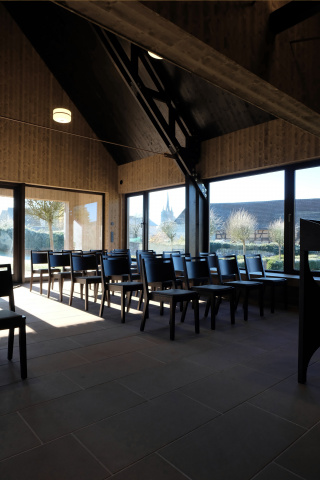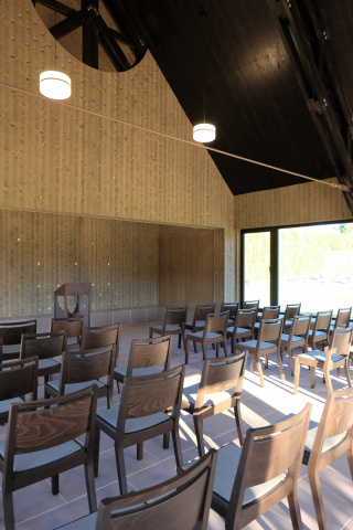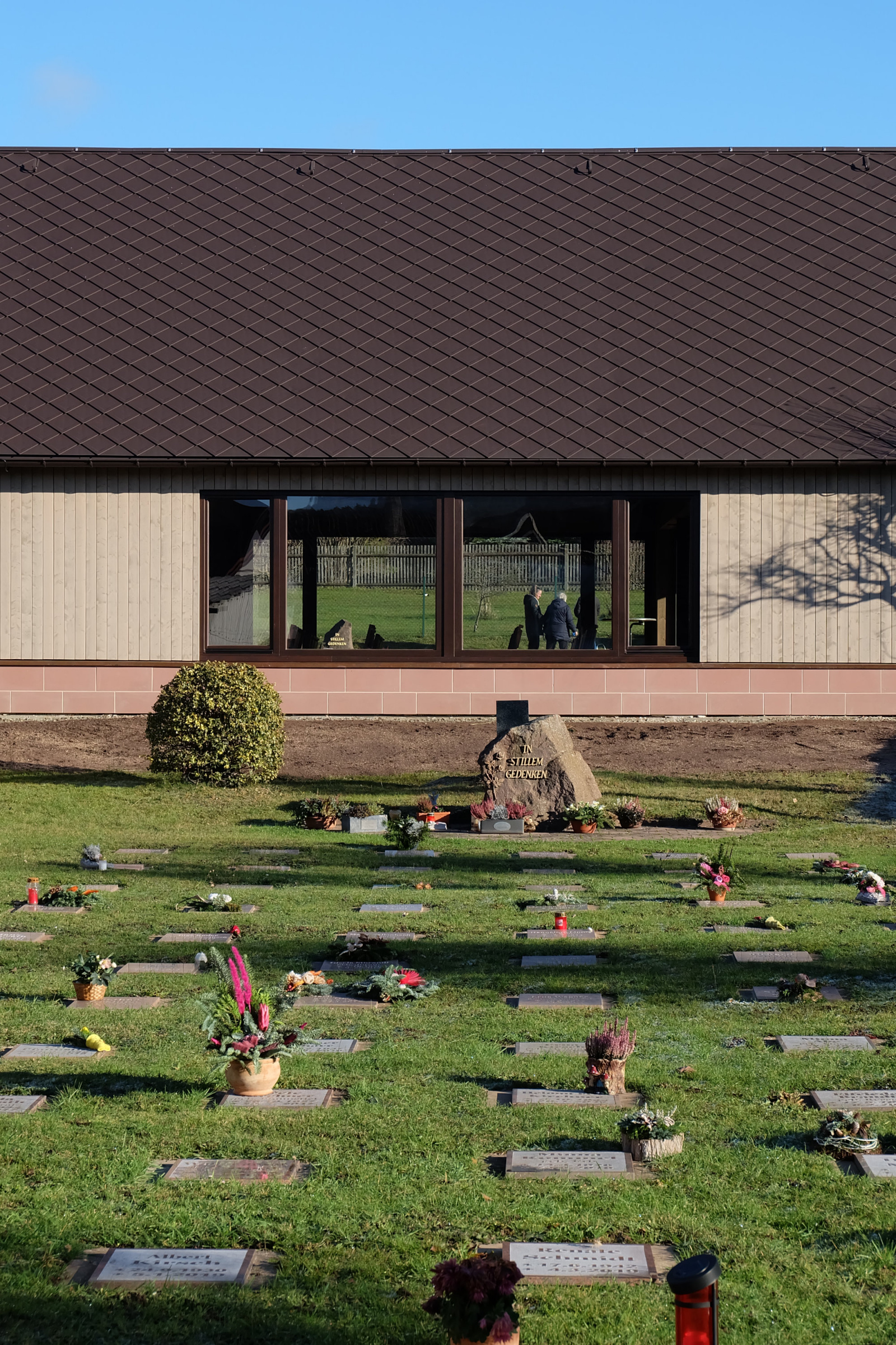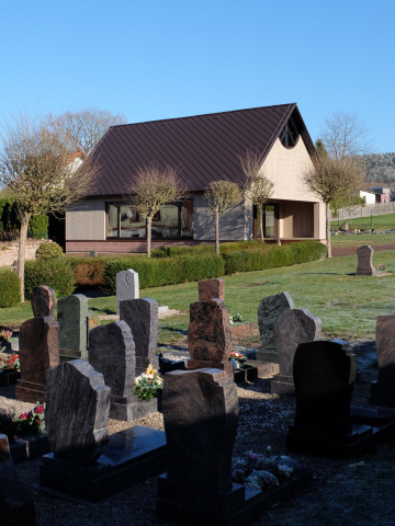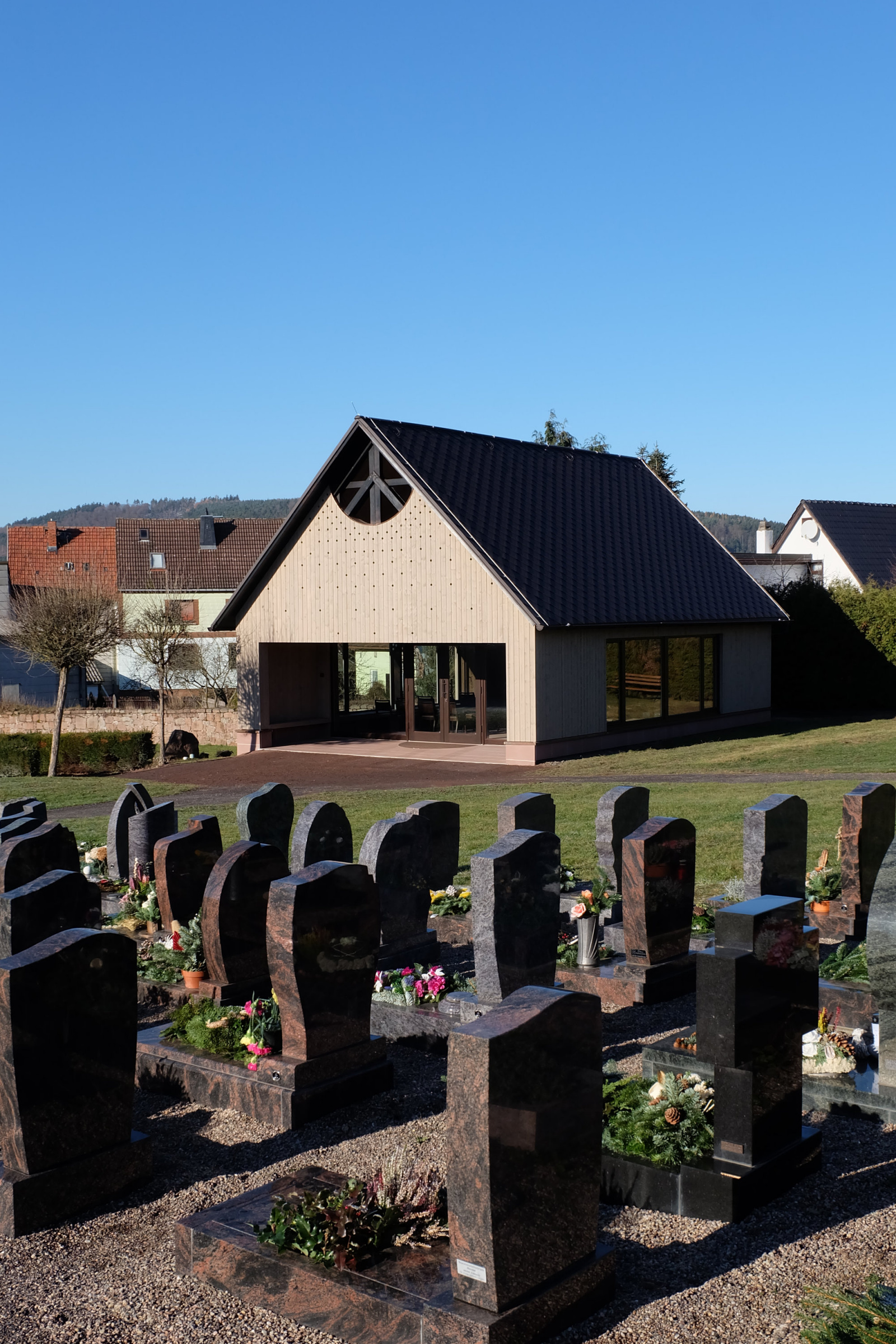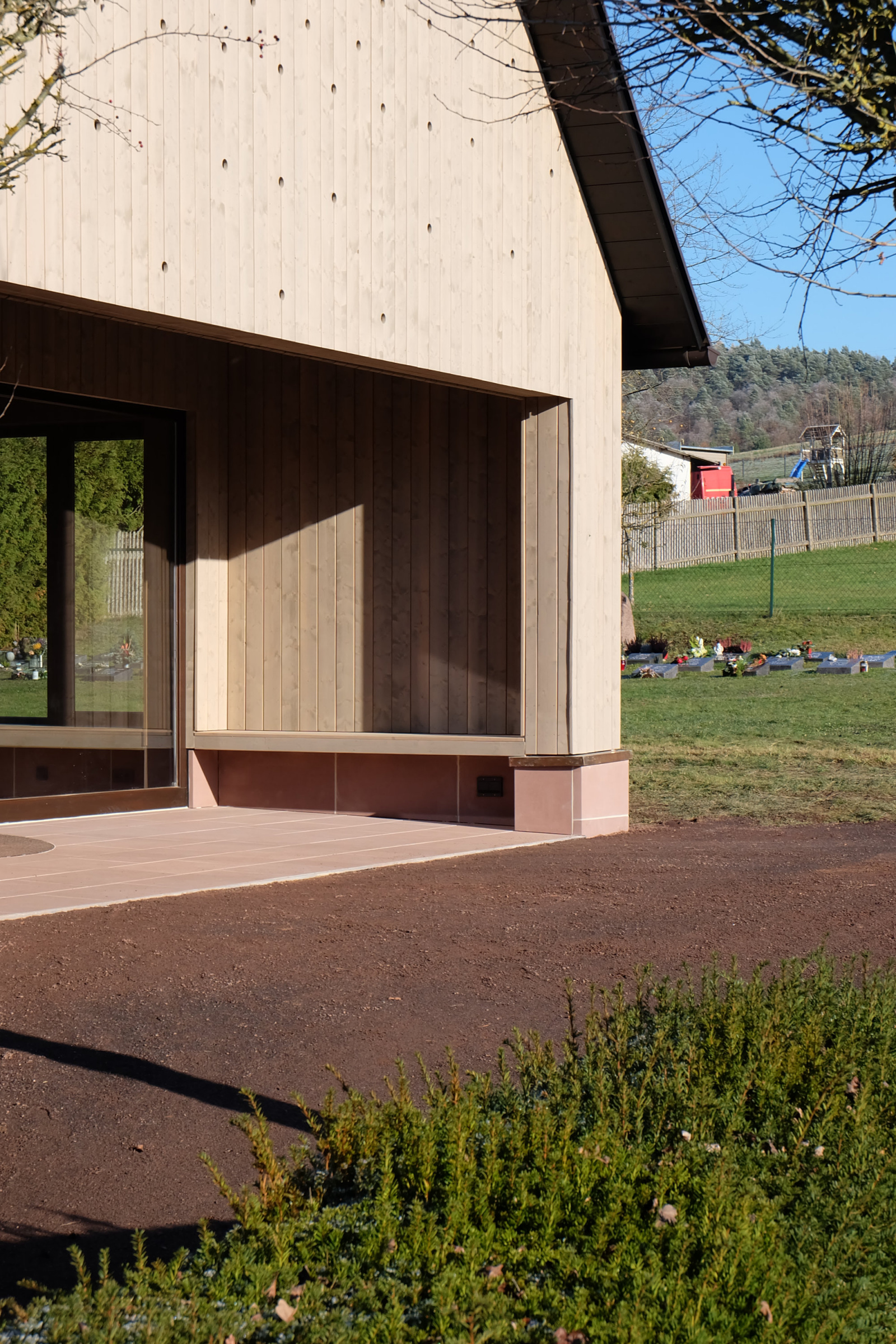 Die neue Trauerhalle schafft einen würdevollen Ort, der sich nicht aufdrängt, aber dennoch als besonderes Gebäude in der Gemeinde erkennbar ist. Der hölzerne Baukörper mit Satteldach und traditionellem Sandsteinsockel fügt sich wie selbstverständlich in das Umfeld ein. Dekor und Raumabfolge verleihen dem weltlichen Gebäude einen spirituellen Ausdruck ohne auf klar religiöse Symbole zurückzugreifen.