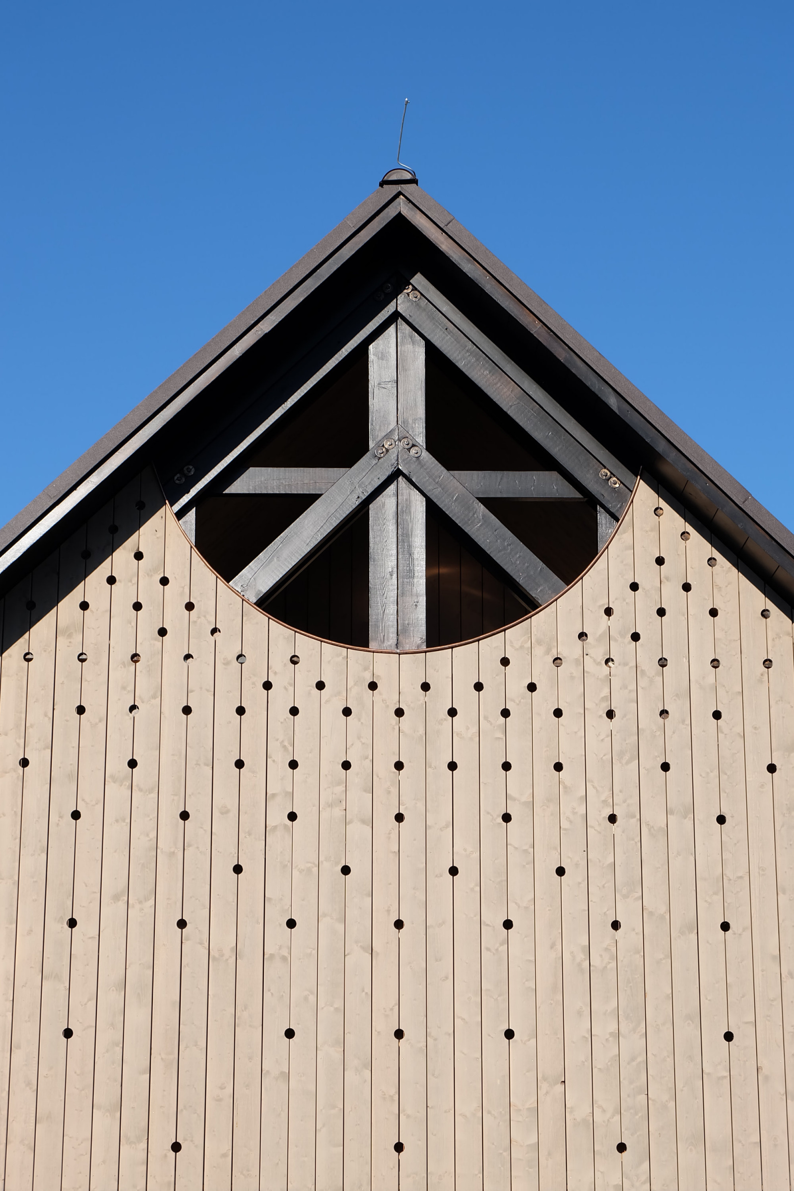Nachhaltigkeit und lokale Wertschöpfung prägen das Konstruktionsprinzip: Alles oberhalb des Sockels besteht nahezu vollständig aus Holz. Die Tragwerksrahmen wurden aus handlichen Vollholzprofilen zusammengefügt und ohne Spezialkran aufgerichtet. Natürliche Oberflächen strahlen Ruhe und Geborgenheit aus und ermöglichen dem Gebäude in Würde zu altern.