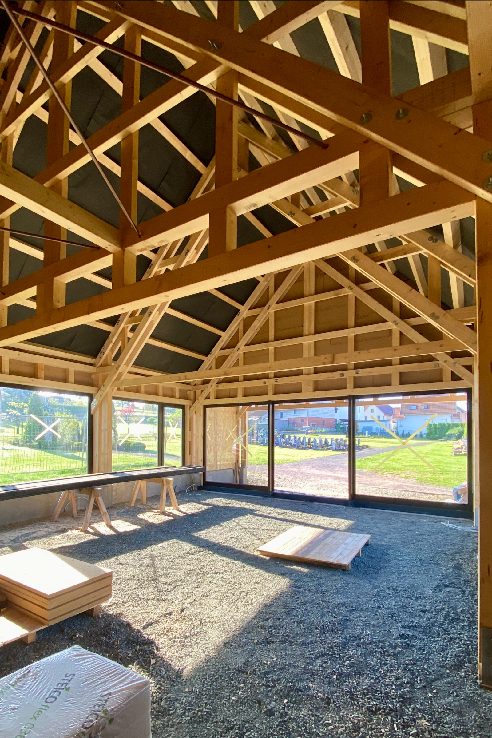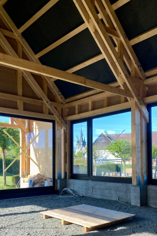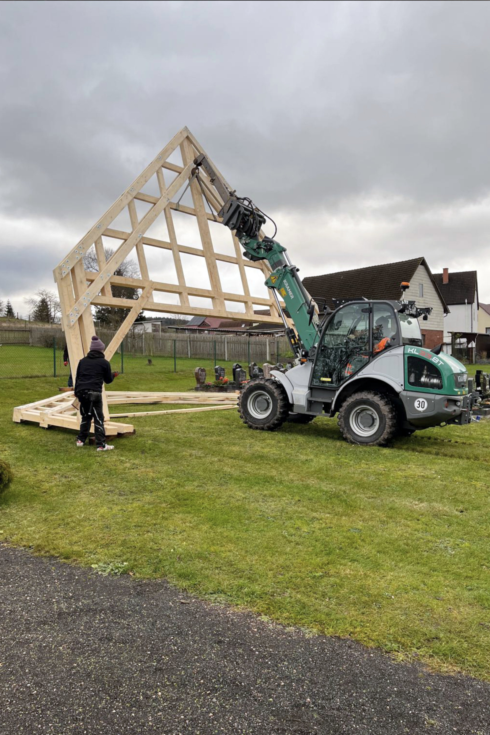 TAKTAK • TRAUERHALLE SCHWALLUNGEN • Tragwerksrahmen (im Bau), Bild: Robert Ilgen