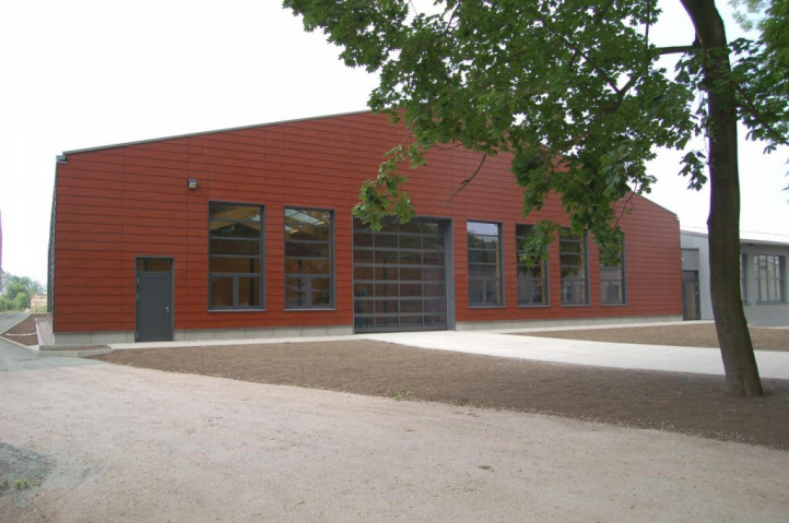 Den Schwerpunkt bildet die große Ausbildungshalle mit ihrer klaren Holz-Tragstruktur.