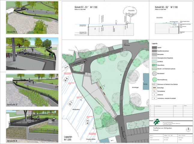 Durch eine räumliche Freistellung und eine sanfte Geländeabsenkung zum Mühlgraben wird der Blick auf das Wasser bereits vom Markt, der Adolf - Barth-Straße oder Ecke Nicolaus- v.- Dreyse - Straße ermöglicht und verbindet die Räume über sich öffnenden Sichtschneisen in die Tiefe des Parks.