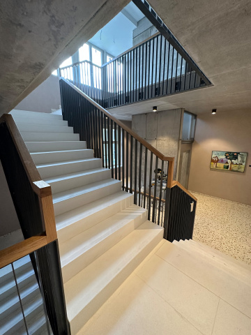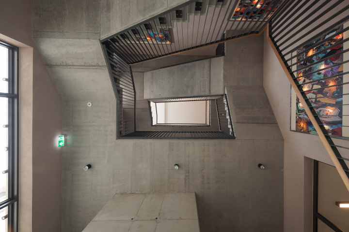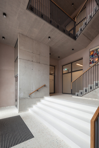 Dabei wurde die bestehende Baukonstruktion im Bestand belassen. Als prägnante Umbaumaßnahme präsentiert sich das neue, zusätzlich geschaffene Treppenhaus mit Aufzug im Bereich ehemaliger Büro- u. Sortieräume. Ohne das Bauwerk im Dach und Fassade zu öffnen, wurde eine monolithische Treppenskulptur in das Bauwerk integriert. Ein nach oben sich verjüngendes Treppenauge und gegeneinander versetzt angeordnete Treppenläufe öffnen das vom Dachgeschoss belichtete Treppenhaus für Tageslicht. Im Erdgeschoss wurden neue Büroräume geschaffen.
