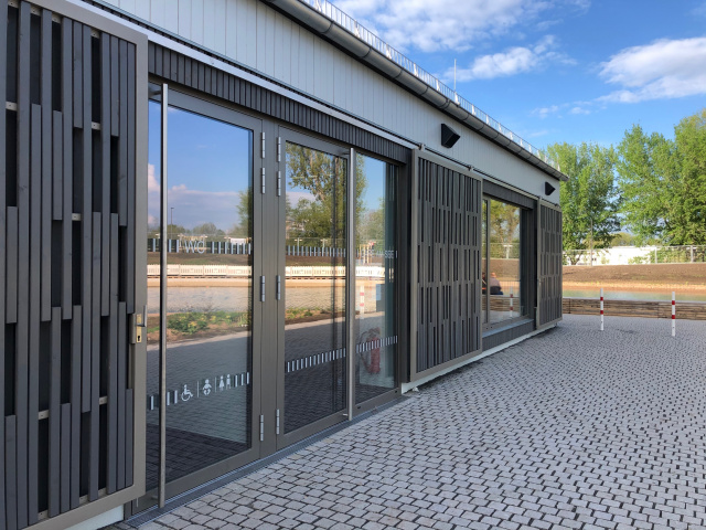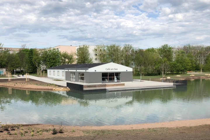 Am schlichten Gebäude wurden die Öffnungen so platziert, dass die aufwendige Außengestaltung des Sees mit einem „Rund-um-Blick“ im Gastraum zur vollen Wirkung kommt. Die Fensterleibungen wurden mit einem „Rahmen“ versehen, welche gleichzeitig als Sitzbank dienen. Da es mitten im Park oft zu Vandalismus kam, waren die Fenster des Jugendhauses vergittert. Großzügige Schiebeläden sollen dem Cafe nachts Schutz geben und können tagsüber gleichzeitig als Verschattung genutzt werden.