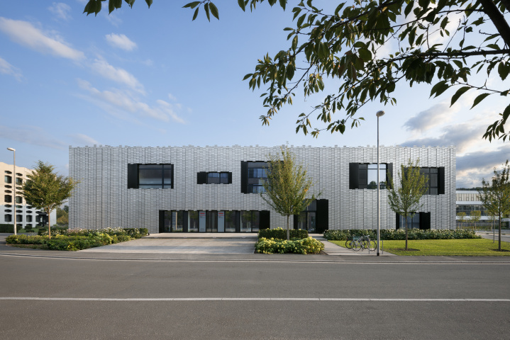 Die Trapezbleche der Fassaden wurden in schmale Streifen geschnitten und vertikal, ungleichmäßig versetzt eingebaut. Der Verfremdungseffekt ist überraschend: die Fassade wirkt wie ein Gewebe aus Stahl.