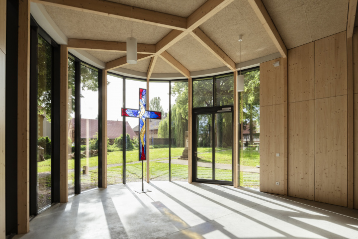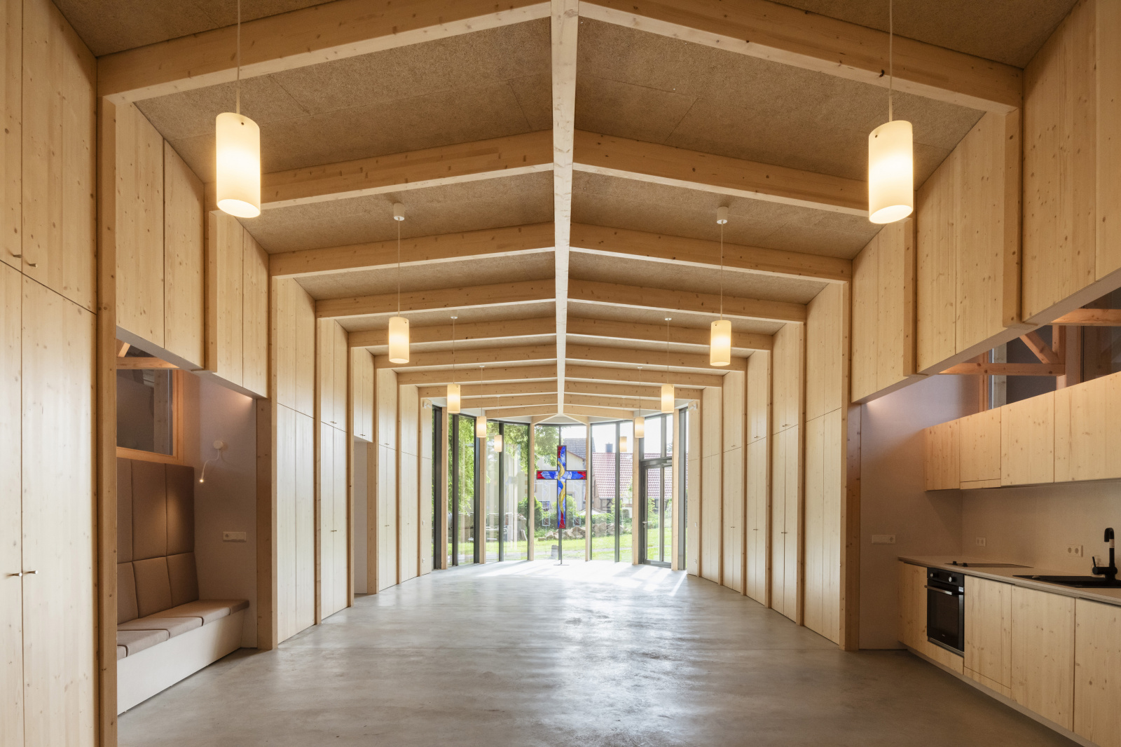 Im Sinne eines ganzheitlichen Ansatzes lag unser Augenmerk auf dem Einsatz regionaler Hölzer und auf der Wiederverwendung vorhandener Materialien, etwa der abgebauten Emporenhölzer für die Holzkonstruktion des Gemeindesaals sowie des rückgebauten und gesicherten Klinkerbodenbelags aus dem Kirchenschiff.