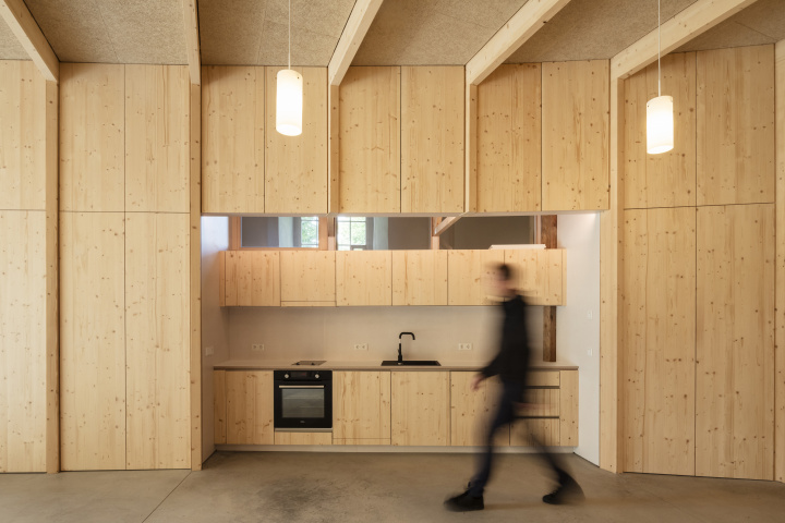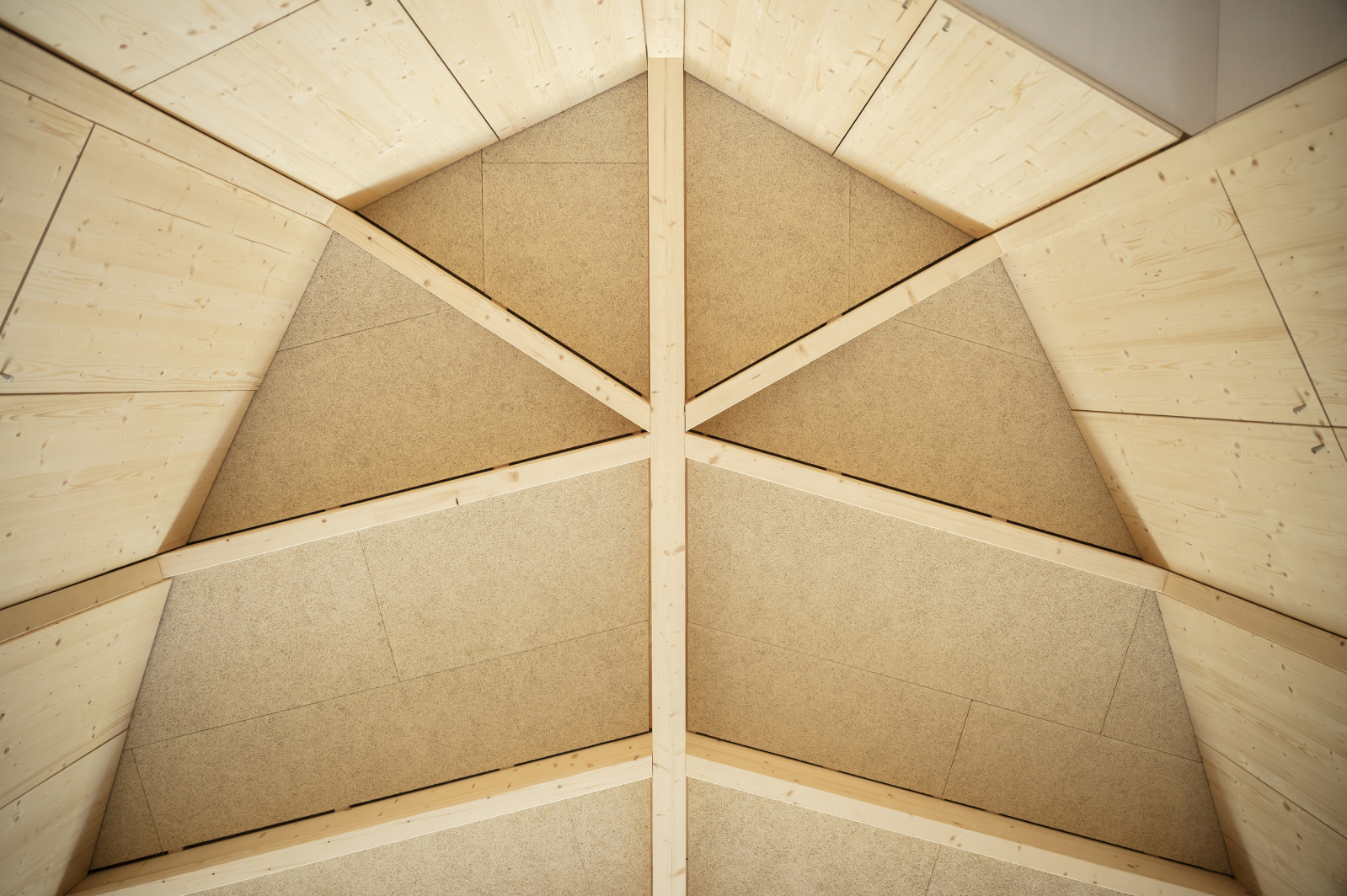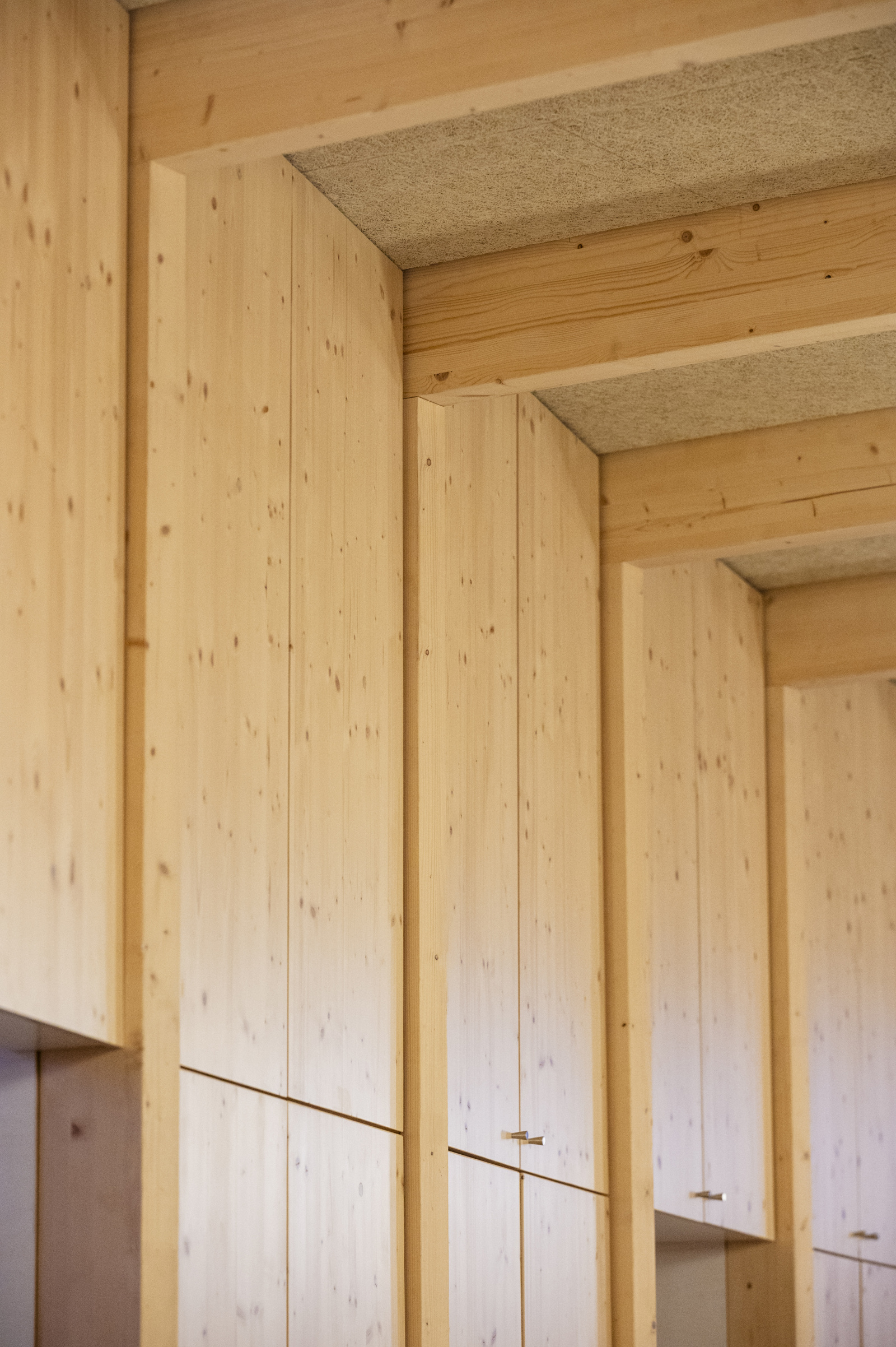Praktische Konstruktionsmerkmale erlauben eine vielseitige Nutzung der neuen „Arche“. Die Wände des Holzovals sind umlaufend als „dienende Schicht“ angelegt, wodurch ein flexibel nutzbarer Raum für Schränke, Technik, Garderobe oder Lager für Stühle und Tische zur Verfügung steht, der weitere Nebenräume überflüssig macht. Und dank einer integrierten Küchenzeile kann hier zusammen gekocht, gegessen und gefeiert werden.