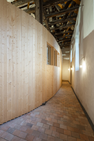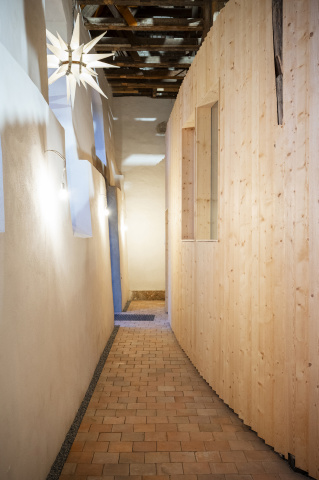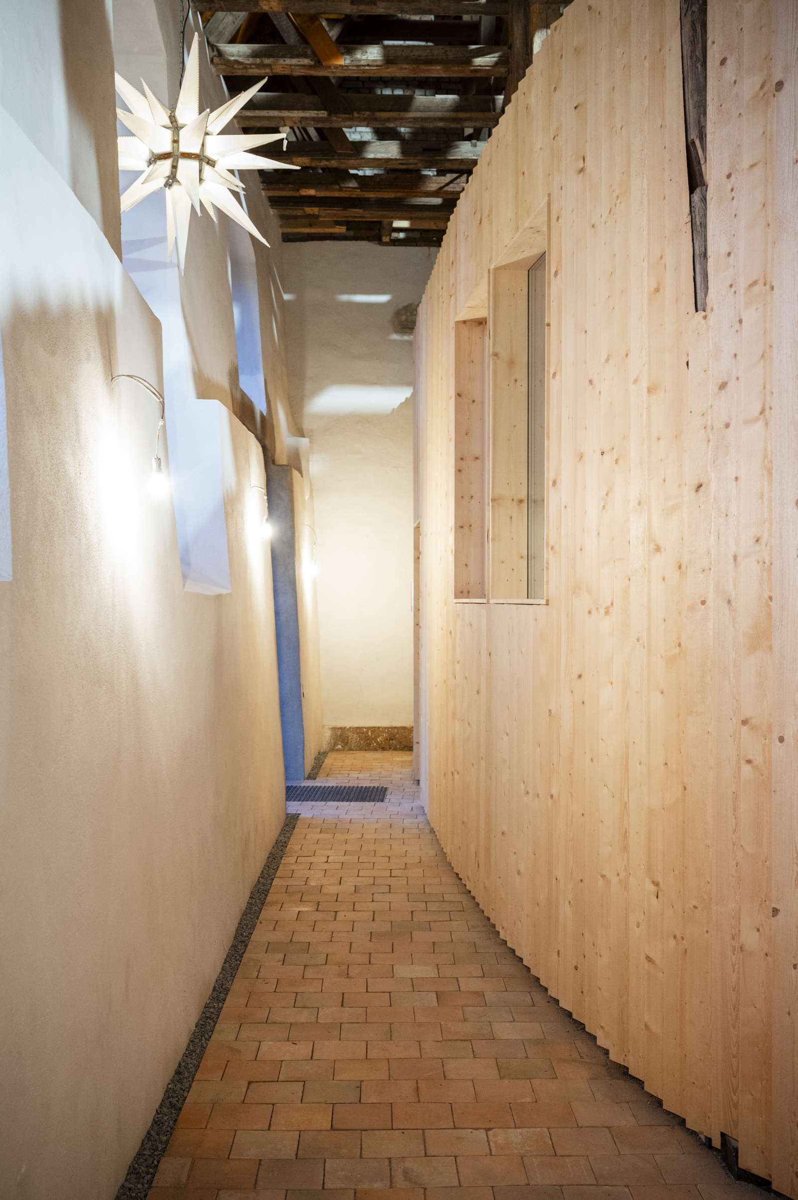 Dieses autarke „Haus im Haus“ verfügt über keine direkte Verbindung zum Saalkörper und den Fensteröffnungen in der Außenwand. Ähnlich einem großen freistehenden Möbel fügt sich der Holzkörper harmonisch in die Gebäudehülle ein, der Raum zwischen Gemeindesaal und Kirchenhülle macht die Kubatur der mittelalterlichen Saalkirche ablesbar. Dieser Freiraum dient nicht nur als Pufferzone für Revisions- und Erhaltungsarbeiten, sondern kann auch als Ausstellungsraum für Kunstgüter sowie zur Dokumentation der Kirchen- und Baugeschichte genutzt werden.