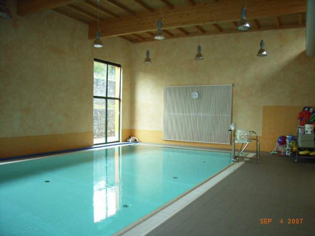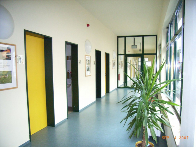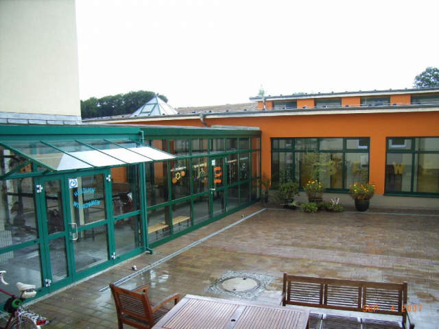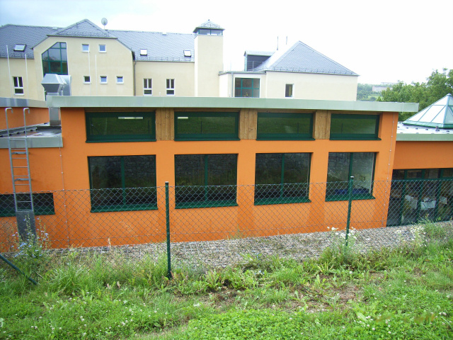 Das alte Schulgebäude wurde durch einen Neubau mit 4 weiteren Gruppenräumen ergänzt. Desweiteren wurden im Neubau ein Bewegungsbecken (5 x 9m) und eine Sportraum eingeordnet. Beide Gebäude sind über einen verglasten Gang miteinander verbunden.
