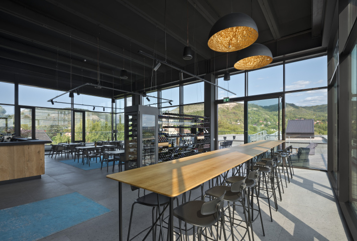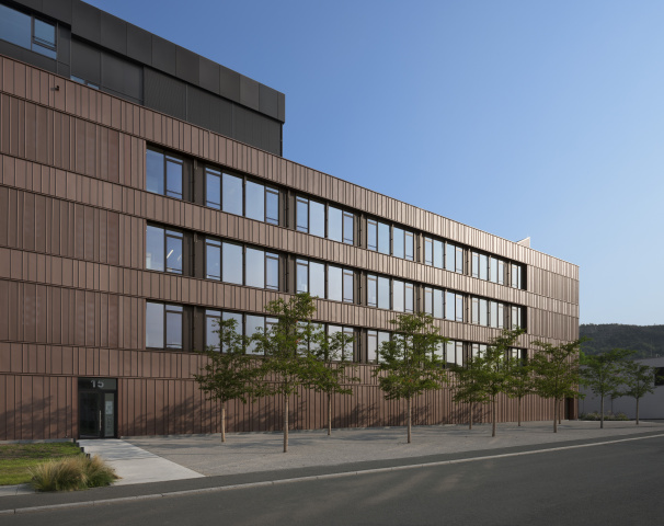 Das Gebäude erhielt eine Winkelfalzfassade mit unterschiedlichen Schärbreiten. Das Gebäudevolumen erfordert eine einheitliche, ruhige Fassadensprache um die Dominanz zu brechen. Die Bestandsfassade wurde rückgebaut und mit neuen Brüstungen und Fenstern versehen. Das Blechkleid in einem warmen, rotbraunen Ton wurde dort, wo die Fenster zu kleinteilig wirkten, in gelochter Ausführung über die Fensteröffnungen geführt. Das ehemalige Technikgeschoss wurde zu einer Weinbar umgebaut, ein öffentlich zugänglicher Ort, dessen Aussenterrasse einen grandiosen Blick über die Kernberge bietet.