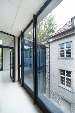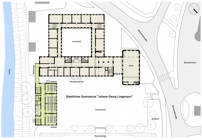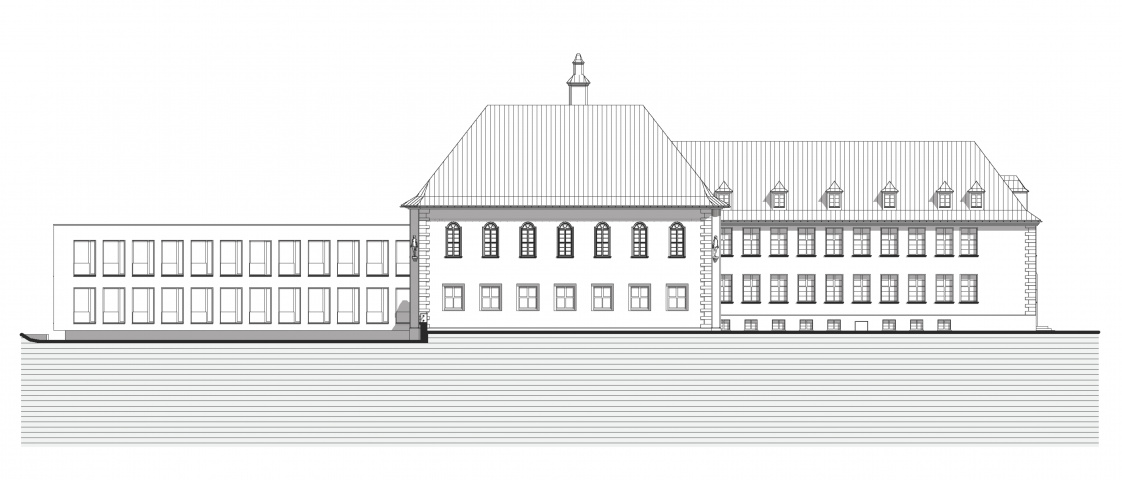 Die Erweiterung des Gymnasiums basiert auf einem unvoreingenommenen Dialog neuer Baukörper mit gewachsenen Bestandsstrukturen. Aufgrund baulich eingeschränkter Nutzungsmöglichkeiten im Untergeschoss wurde es notwendig einen ergänzenden Neubau anzugliedern. Die Stellung der Baukörper zueinander lässt dem historischen Bestand den Raum ihn angemessen in Szene zu setzen. Der zurückversetzte Verbindungsgang zwischen Bestand und Neubau ist als transparente Fuge nicht spürbar. Die Klassenräume orientieren sich zum Hof, während die dienenden Räume rückwärtig angeordnet sind. Der Neubau ist durch eine ruhige, moderne Fassadengestaltung sowie durch transparente, glatte Oberflächen eindeutig ablesbar. Seine ruhige und sachliche Fassadenstruktur entspricht der Klarheit der Bestandsbaukörpergliederung.