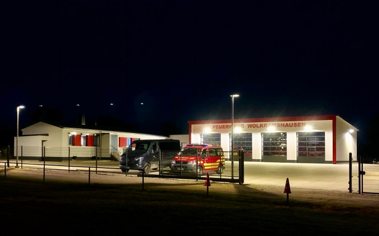 Durch die Umstrukturierung der freiwilligen Feuerwehr Wolkramshausen in eine überregionale Feuerwehr entstand ein erheblich größerer Platzbedarf und die alte kleine Feuerwehr in der Ortsmitte reichte nicht mehr aus. Von der Gemeinde wurde ein vorhandenes Gebäude des Straßenbauamtes Thüringen in Ortsrandlage erworben. Dieses konnte saniert und durch einen Verbindungsbau in dem sich der Sozialtrakt befindet und eine große Fahrzeughalle mit 4 Stellplätzen für Einsatzfahrzeuge erweitert werden. Die Fahrzeughalle kennzeichnet sich durch eine weit sichtbare, rechteckige Einrahmung mit Stehfalzblech aus. Auf einer Grundstücksfläche von ca. 3000m² entstanden ebenso 18 Parkflächen, eine 200m² große Versickerungsrigole, eine PKW Zufahrt, eine Alarmausfahrt sowie eine 250m² große Übungsfläche.