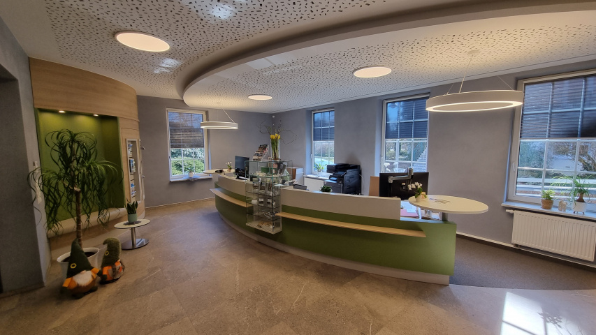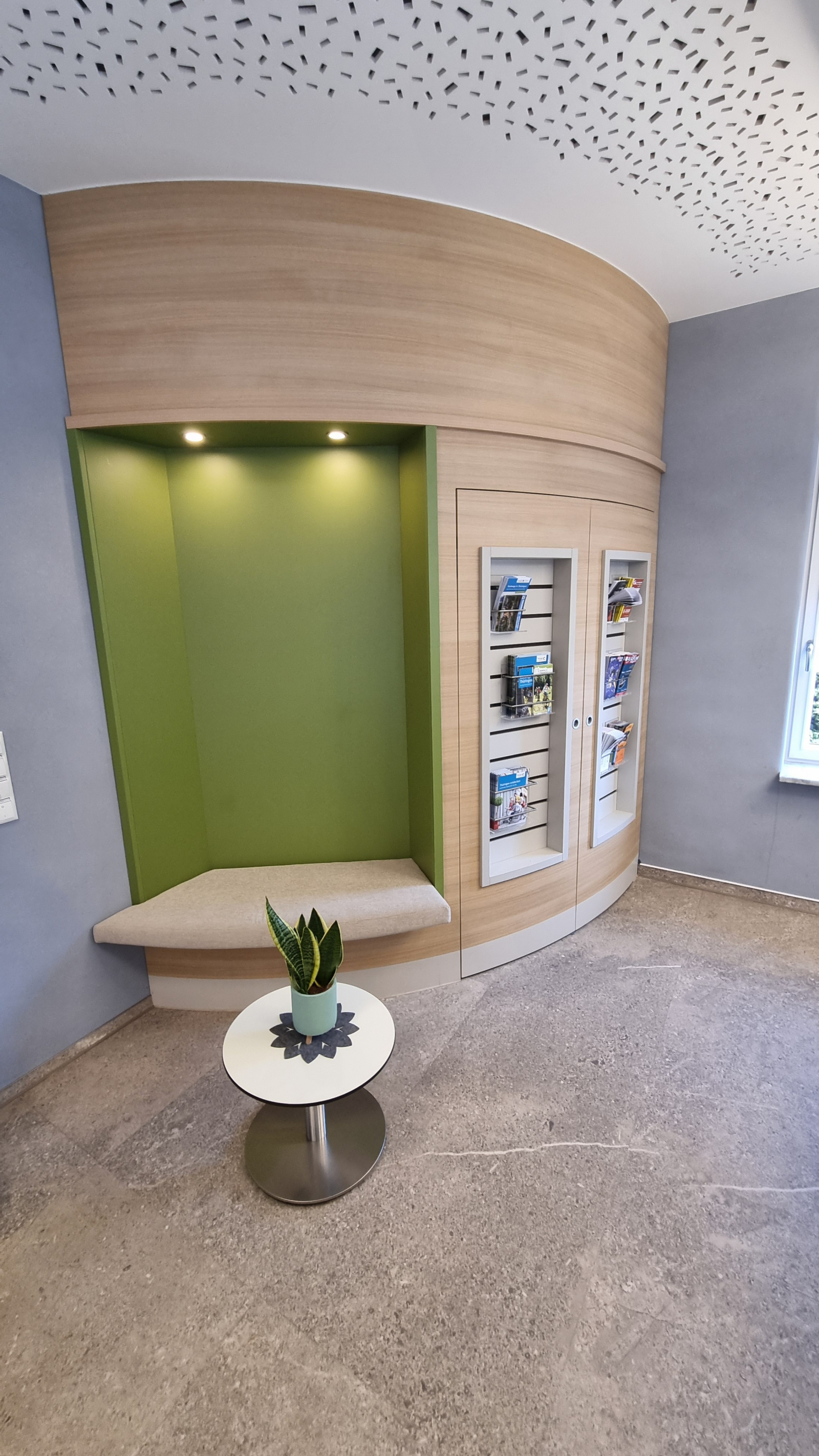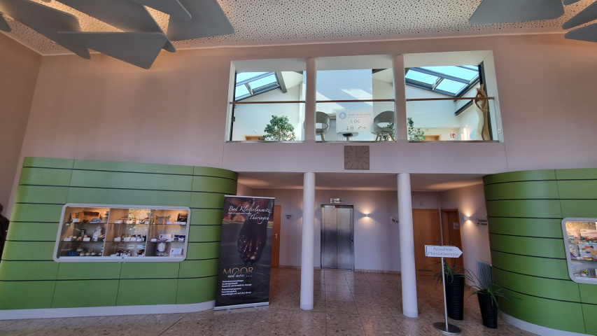 Herstellung eines räumlich und optisch schnell erfassbaren Bezugs zwischen Wandelhalle und der offen, einladend, neu zu gestaltenden Touristinfo, durch Vergrößerung des Durchgangs, durch Behindertengerechte Tresen-Dialogelemente mit dahinter zwei Frontdesk-Arbeitsplätzen, einer Besucher-Sitzmöglichkeit, sowie Stauraum und einem innovativen Informations-Präsentationsflächensystem für Flyer, Infomaterial und Verkaufssouvenirs in Vitrinen. Integration des EDV-Serverbereichs durch Verkleidung, sowie komplette akustisch wirksame Decken- und Lichtgestaltung in Einklang mit einer abgerundeten an den Kurmittelbetrieb angepassten Designsprache. Über die Auswahl der gerundeten Formensprache und der sich in die Wandelhalle erstreckenden Farb- und Formgebung der Möblierung in frischen gelbgrünen Farbakzenten wird die funktionale und optische Einheit hergestellt. In der Wandelhalle wurde die Sitzmöblierung mit handelsüblichen Herstellerkollektionen und zwei neuen symmetrisch angeordneten Einbauelementen mit Vitrinen- und Geräte-Einbauelementen zur Integration bestehender Getränkeautomaten neu gestaltet. Außerdem wurde in der Wandelhalle aus akustischen und Lichttechnischen Gründen die Decke als Akustikstreulochdecke mit darunter abgehängten LED- hinterleuchteten, farblich gestalteten Akustiksegeln neu gestaltet. Das Projekt wurde mit Fördermitteln des Freistaats Thüringen unterstützt.
