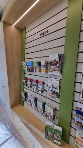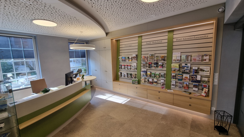 KMH_Bad Klosterlausnitz_Touristinfo_Tresen mit Prospektwand_EG, Bild: Christian Poppitz -