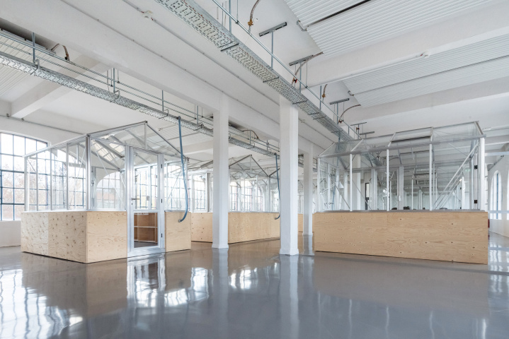 Verwoben mit der kollektiven Aneignung fand ein schrittweiser Ausbau des Eiermannbaus statt. Der kollektive Lernprozess brachte die Talente des Gebäudes mit den Bedarfen der Nutzer:innen der Open Factory in Übereinstimmung. 2018 entwarfen die Architekt:innen des IBA Teams zuerst eine Pilotfläche, ein Ausbaukonzept für lediglich 750 Quadratmeter im zweiten Obergeschoss, die seither als IBA Büro und als eine Art Showroom fungieren. Die Herausforderung bestand darin, die einfachverglasten Räume mit einfachen Mitteln ganzjährig nutzbar zu machen und zugleich den Denkmalanforderungen und der Ästhetik der Moderne gerecht zu werden. Es ging um ein kreatives Unterlassen, nicht als Einschränkung der Nutzungsqualität, sondern um Nutzungen in dem nachfrageschwachen Kontext überhaupt wieder zu aktivieren. Und so wurde eine besondere Haus-in-Haus-Lösung entwickelt: 15 kleine Industrie-Gewächshäuser auf Holzsockeln wurden als Büros eingebaut. Die bisher fehlende Gebäudetechnik wurde auf zentralen Trassen realisiert, so bleiben die Flächen nutzungsneutral. Zur Temperierung der Hallen wurden Deckenstrahlplatten installiert, die Temperatur in den Gewächshäusern wird durch Infrarotheizkörper individuell gesteuert. Es ist ein low-tech-Konzept, das auch auf organisatorische Lösungen, wie Querlüftung und Nachtabkühlung setzt. Das Heizkonzept basiert auf dem temperierten Makroklima der Hallen von maximal 15 Grad und dem Mikroklima in den Gewächshäusern. Der Ausbau wurde in großen Teilen durch ein studentisches Bauteam realisiert und die Gewächshaus-Lösung ist als Open Source online frei zugänglich. Der Pilotausbau erlaubte Erfahrungswerte zu sammeln und Interessierte zu akquierien. 2022 und 2023 folgte dann der Gesamtausbau des Eiermannbaus und die baulichen Vorbereitungen für die zukünftige Entwicklung der Freifläche. Die minimalivasive Umbaustrategie basiert auf rückbaubaren und erneuerbaren Eingriffen und dem Reparieren und Pflegen des Vorhandenen. Auch Eiermanns respektvolles Weiterbauen ist Vorbild dafür. Lediglich 350 Euro/m2 Bruttogeschossfläche wurden letztendlich in den Gesamtausbau investiert.