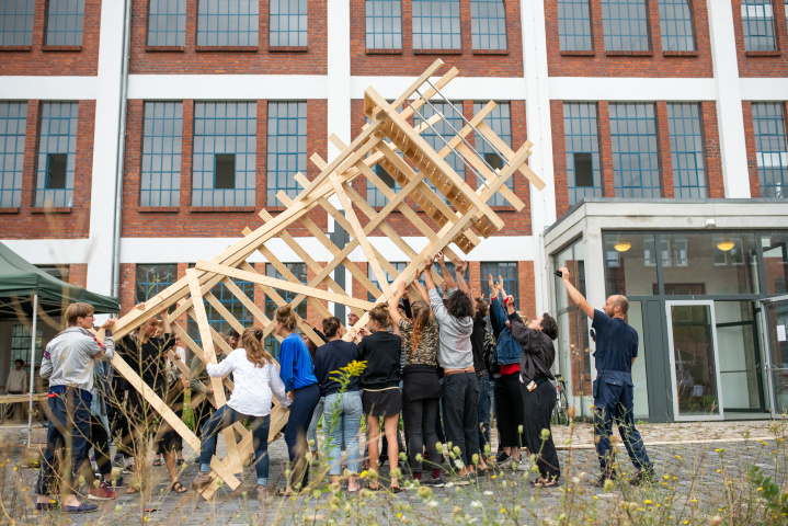 Die Entwicklung zur Open Factory basiert auf dem im ersten IBA Campus 2016 entwickelten Leitbild und einem anschließend erarbeiteten Finanzierungs- und Betreiberkonzept. Der vierzehntägige IBA Campus 2016, der in Kooperation mit der Wüstenrot Stiftung stattfinden konnte, war aber auch eine erste gemeinsame Probenutzung des Standortes - viele weitere Teilhabeformate folgten. So fand 2018 ein zweiter Campus als DesignBuild-Projekt statt. Die dabei entstandene, inspirierende Ausstattung nutzte 2019 das 40-tägige Kunstprojekt „Hotel Egon“ im Eiermannbau, das über 300 Übernach-tungsgäste anzog. Auch das ersten Corona-Jahr 2020 sollte die kollektive Aneignung des Standortes nicht ausbremsen, also stellte die IBA verschiedene Bereiche im Eiermannbau und auf der Freifläche mietfrei zur Verfügung. Die Open Factory erlebte so ihre Generalprobe: Von Juni bis November arbeiteten insgesamt 188 Beteiligte im Eiermannbau, eröffneten auch Ausstellungen, gaben Konzerte und luden hunderte Gäste ein. Es war der Beweis, das die Architekturikone ein großartiger und passender Ort für die Kunst und nachhaltige Produktion ist. Auch an der folgenden Planungs- und Umbauphase waren viele beteiligt, so wurde das Freiflächenkonzept gemeinsam mit ersten Pioniernutzer:innen entwickelt, Studierende und Apoldaer Schüler:innen waren unmittelbar am Umbau des Eiermannbaus beteiligt.