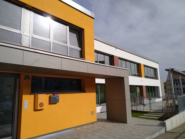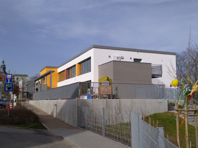Realisiert wurde in der Innenstadt von Sondershausen der Umbau der ehemaligen Stadtbibliothek zu einem Kindergarten mit Krippenbereich für ca.75 Kinder. Das Gebäude der ehemaligen Stadtbibliothek wurden in den 1980er Jahren als Kindergartenkombination in DDR-Fertigteilbauweise errichtet. Durch die Nutzungsänderungen erfolgten größere Eingriffe in die vorhandene Grundriss Struktur sowie die Aufstockung eines Dachbereiches auf der Nordseite des Gebäudes. Durch die umfangreichen Baumaßnahmen entstanden großzügige und offene Gruppenräume für den Kindergarten, ergänzt mit zahlreichen energetischen Maßnahmen wie der Einbau von Fußbodenheizungen, Lüftungsanlagen und gedämmten Fassaden- und Dachkonstruktionen. Die überwiegend weißen Fassaden des Gebäudes erhielten eine zeitgemäße und moderne Ansicht mit farblich abgesetzten Fensterbändern. Zu der umfangreichen Baumaßnahme zählte auch die Neuanlage der Außenspielflächen mit Wegen und Rasenflächen und zahlreichen Außenspielgeräten. Dabei wurde das vorhandene Hanggefälle des Grundstücks zu einem "Rodelhang" modelliert.