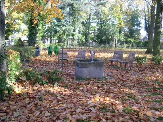 Für die Neugestaltung der Gräberfelder wurden die vorhandenen Wege aufgegeben. Die Erschließung erfolgt über Schrittplatten im Rasen. Der Verzicht auf befestigte Wege senkt Unterhaltskosten und erhöht den Grünanteil. Durch die Entnahme einzelner Bäume konnte im Zentrum ein Sitzplatz mit Brunnen angelegt werden. Die Gräberfelder werden durch freiwachsende Hecken begrenzt. Die Verwendung eines von den Planern entworfenen und patentierten Einfassrahmens führte zu vielfachen Vorteilen. Kaum wahrnehmbar liegen die Grabeinfassungen höhenbündig im Rasen. Sie dienen gleichzeitig als Pflegekante für die Rasenmahd. Nicht belegte oder gepflegte Gräber können übermäht werden. Die Materialdicke von 10 cm ermöglicht eine ungebundene Verlegung in Splitt. Im Wurzelbereich der Bäume konnten somit Eingriffe vermieden werden.