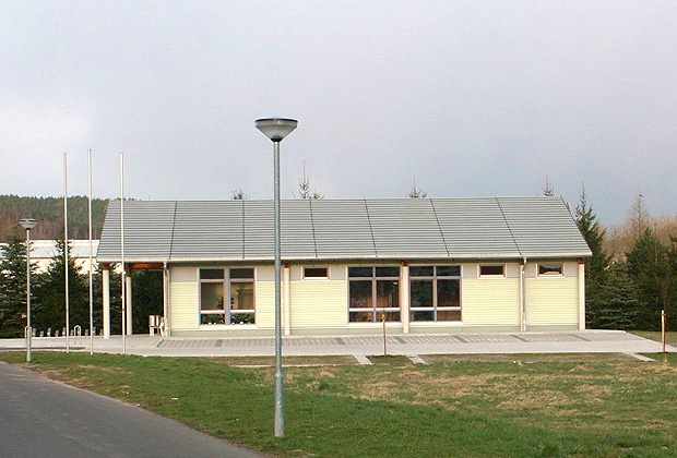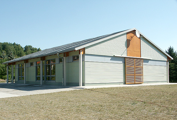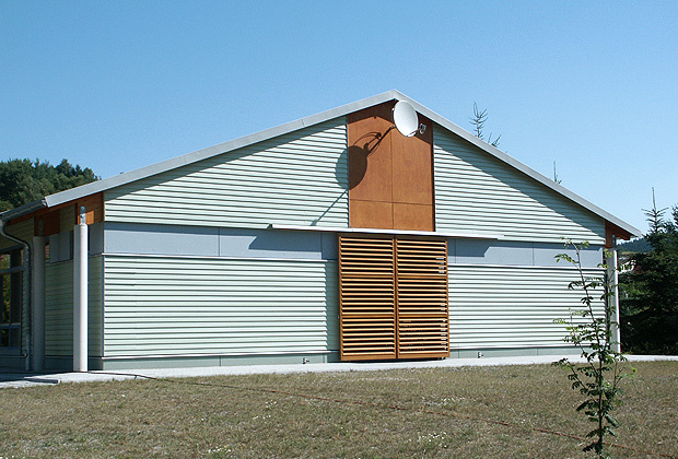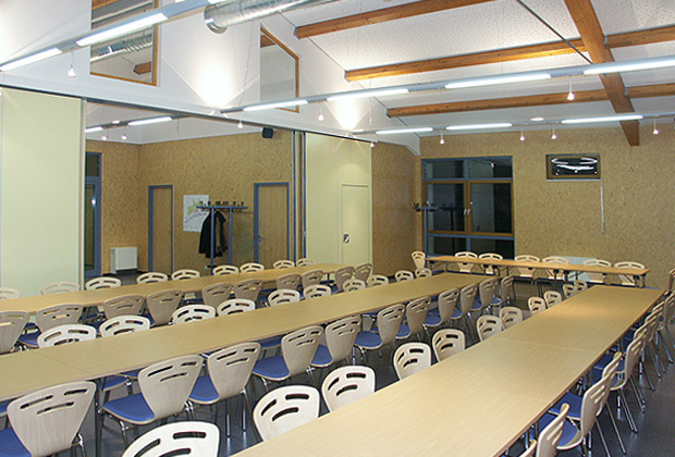 eingeschossige Gebäude in Holzrahmenbauweise beherbergt einen durch eine mobile Trennwand teilbaren Mehrzweckraum, der bei
