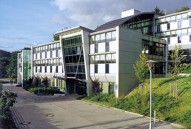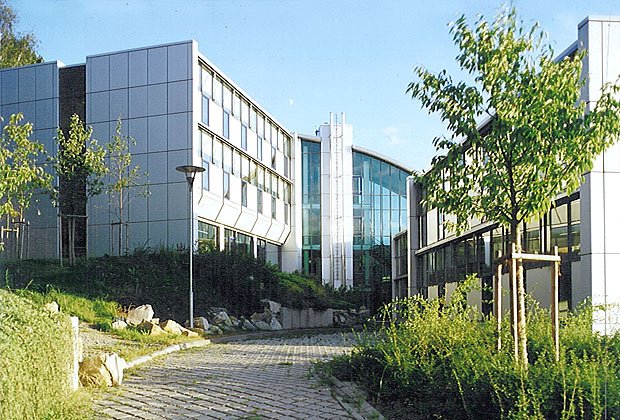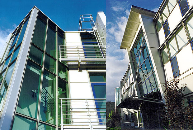 Das Verwaltungsgebäude wurde aufgrund des steilen Geländes höhengestaffelt konzipiert. Es entstanden 3-geschossige Gebäudeteile, die sich
