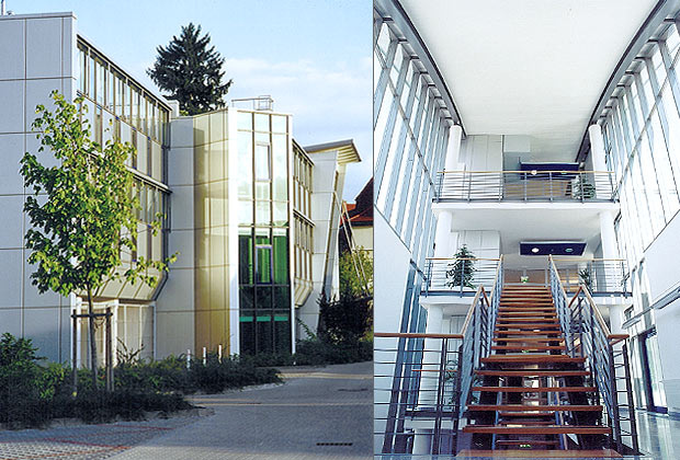 die als zentrales Verbindungsbauteil das Foyer, die Treppenanlage und den Fahrstuhl aufnimmt. Die Gebäudeteile (außer Spange) erhielten ein