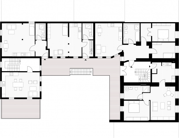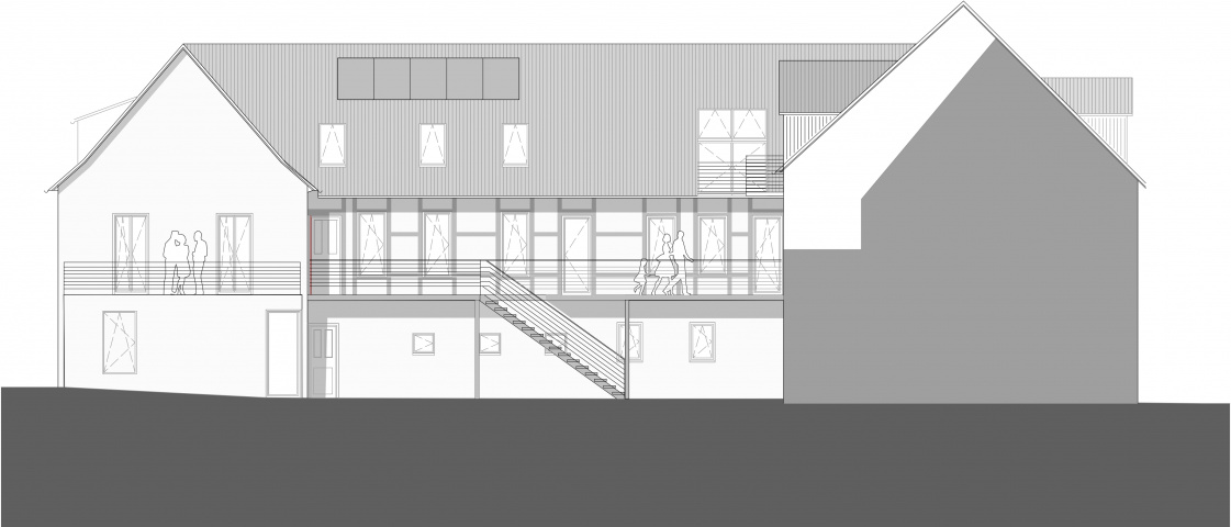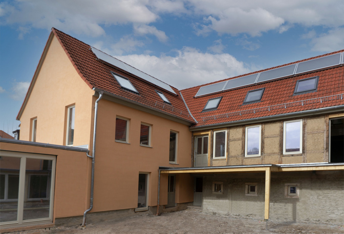 Der Vierseitenhof in der Ortslage von Neudietendorf stammt aus dem 18. JH. Seither erfolgten viel Umbauten. Die jetzige Eigentümerin hat den Hof 2020 erworben und komplett umgestaltet. Nach Abschluss der Arbeiten finden darin 8 Wohnungen sowie ein Eiscafe Platz. Bei der Umgestaltung war es der Bauherrin wichtig auf ökologische und nachhaltige Materialien zu achten. So wurde der Hof als KFW Effizienzhaus Denkmal saniert und mit ökologsichen Baustoffen ausgebaut. Auch ging es bei dem Denkmalensemble darum, die historischen Baustoffe zu erhalten.