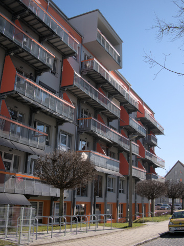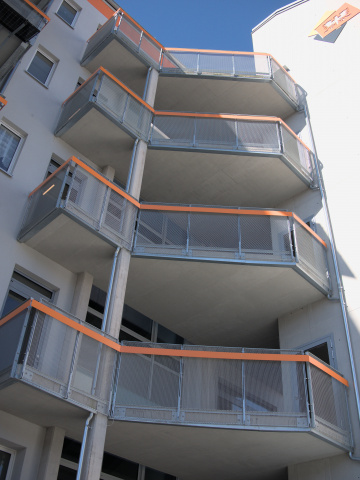 Die vorhandene Gebäudestruktur wurde durch Aufstockung und Vorstellen von Balkonstahlkonstruktionen und eines Sicherheitstreppenhauses verändert.