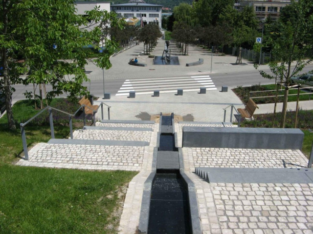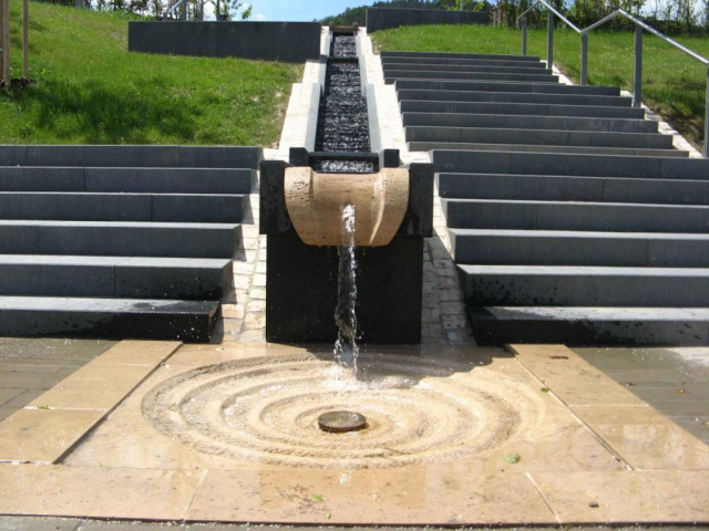 Dazu wurde als prägendes Element zwischen Schrödinger Straße und der parallel verlaufenden Anliegerstraße die Wasserachse als Rinne aus Beton- und Natursteinelementen ausgebildet, die, eingerahmt von einer Treppenanlage, stufenartig vom Quell- zum Auffangbecken verläuft.
