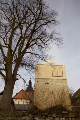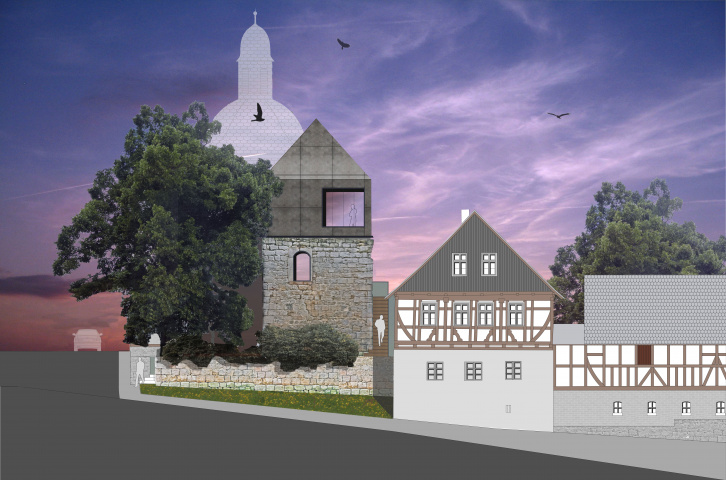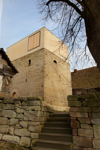 "Architektur hat Bestand"- unter diesem Motto präsentiert sich der sanierte Wehrturm aus dem 12. Jahrhundert mit der neuen Sichtbetonaufstockung als Aussichtsgeschoss. Die kleine romanische Burganlage in Volkerode befindet sich auf einem höher gelegenen Sandsteinfelsen in Dorfmitte. Zur Anlage gehören ein Wehrturm, ein Herrenhaus sowie ein Backhaus, umgeben von einer umlaufenden Ringmauer. Der Wehrturm aus dem 12. Jahrhundert war in schlechten Zustand und wurde nun statisch gesichert, konserviert und restauriert. Zum gestalterischen, funktionalen und konstruktiven Abschluss des Wehrturmes wurde ein neues Dachgeschoss als Aussichts- und Lüftungsgeschoss auf den vorhandenen Natursteinmauern errichtet. Die Aufstockung ist als archaisch wirkender, glatt geschalter Sichtbetonkubus mit geneigten Dachflächen hergestellt. Große Fassadenöffnungen, welche mit Holzklapp- Schiebeelementen verschlossen werden können, dienen zur Be- und Entlüftung und bieten einen Ausblick in die umgebende Landschaft bis hin zum Höhenzug Gobert. Alle weiteren neuen Zutaten wie Treppen, Türen und Fenster wurden in unbehandelten, rohen Stahl hergestellt.