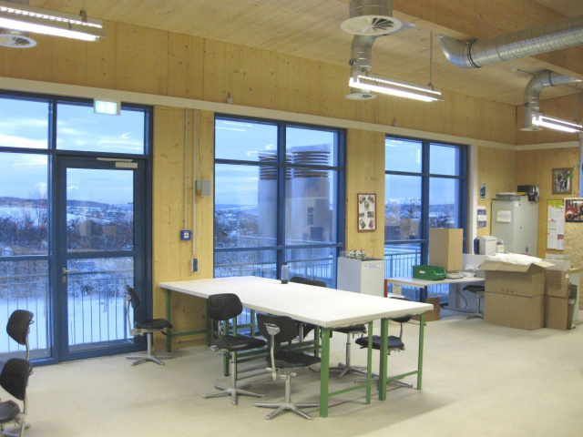 Durch die bis auf den Fußboden reichenden Fenster und die innenseitig sichtbare Holzoberfläche der Wände und des Daches entsteht eine angenehme Arbeitsatmosphäre. Als Fußbodenbelag wurde ein fugenloser Terrazzoestrich in den Werkstätten und Fluren gewählt, da dieser extrem verschleißfest und pflegeleicht ist.