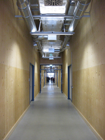Sämtliche Elektro- und Lüftungsinstallationen wurden sichtbar verlegt, um Kosten zu sparen und höchste Flexibilität zu sichern, da sie aufgrund der Holzkonstruktion problemlos an sich ändernde Nutzungsanforderungen angepasst werden können.