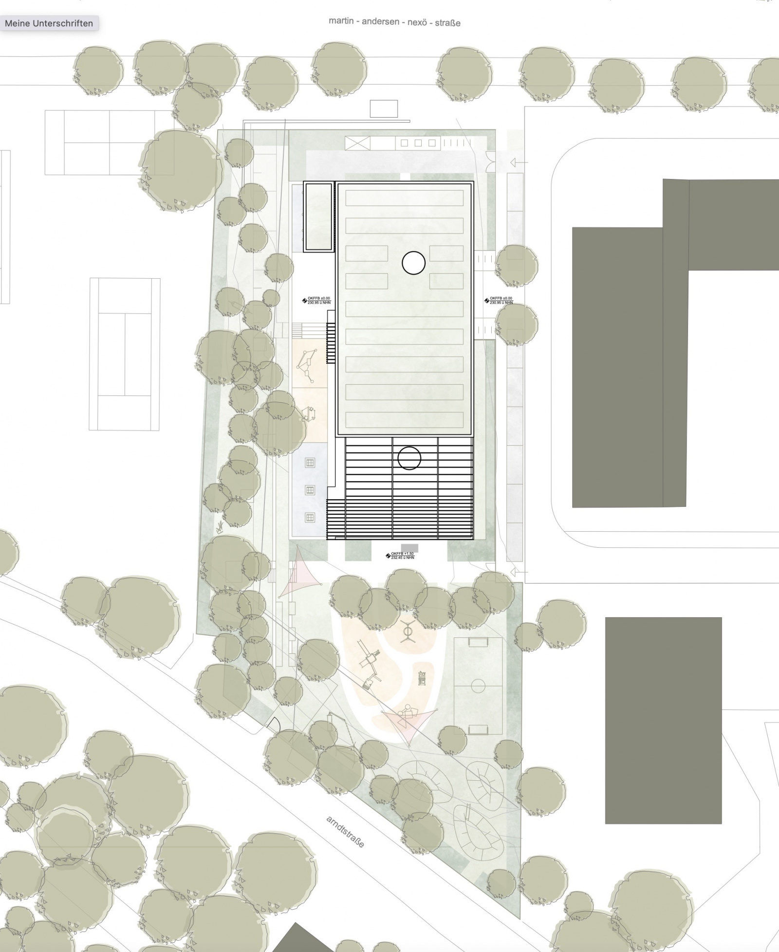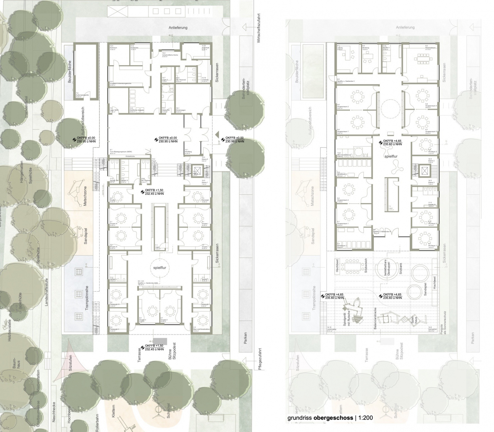 Leitidee– Ein Ort des Wachsens zwischen Stadt und Wald Der Neubau der Kita bildet das Bindeglied zwischen Stadt und Landschaft und wird zum Ort des Wachsens und Entdeckens. Inspiriert von der Korczak-Pädagogik entstehen Räume, die Achtung, Wertschätzung und Partizipation fördern. Holz als prägendes Material schafft Wärme und Nähe zur Natur. Klare Strukturen und offene Bereiche ermöglichen Orientierung, Selbstständigkeit und Gemeinschaft – Es entsteht ein Haus, das Bildung und Natur miteinander vereint.