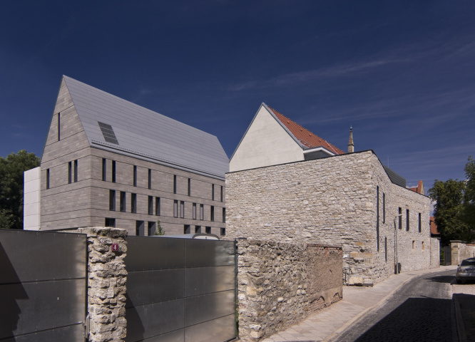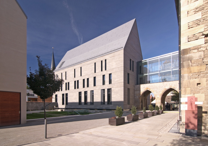 Der Besucher findet Zugang aus dem transparenten Foyer und Erschließungsriegel über kubisch ausgeformte Stege. Repräsentations- und Bürogeschoss können zusätzlich über die gläserne Brücke vom Hauptgebäude erreicht werden. Die Architektur des Neubaus ist zeitgemäß. Es werden historische Materialien verwendet, als Fassadenmaterial Muschelkalkstein, als Dacheindeckung Kupfer naturbelassen sowie Stahl-Glas Fensterkonstruktionen. Der Erschließungsriegel wird von einem Sichtbetonrahmen umschlossen, die Längsseiten füllen selbsttragende Stahlpfosten-Glasfassaden.