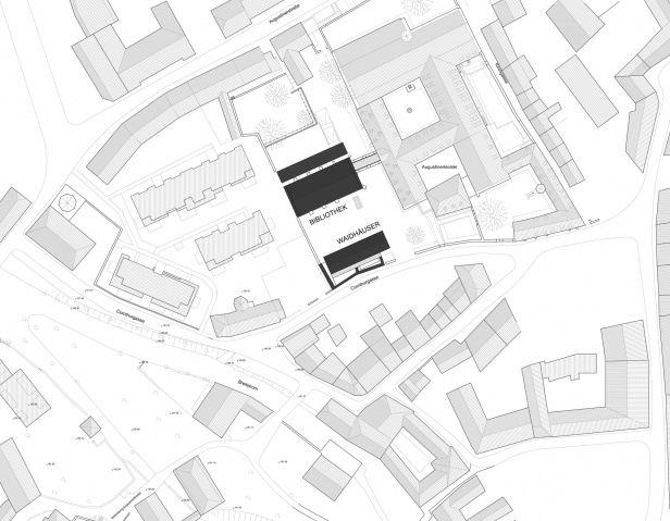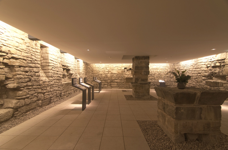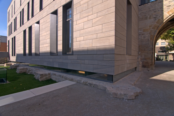 Auf der Nordseite befinden sich im freigestellten Erschließungsriegel Eingang, Treppen, Aufzug und Sanitärbereich. Die verglasten Längsseiten erlauben den Durchblick zu den historischen Gewänden und Mauerresten, die Transparenz erleichtert die Orientierung im Eingangsbereich. Der Veranstaltungsraum im Erdgeschoss erhält Seitenlicht über die konisch gefassten Fenstergewände sowie die verglaste Deckenrandfuge. Die Dimension der mächtigen Bestandsmauern ermöglicht die Gründung des Neubaus auf mittig gesetzten Mikrobohrpfählen sowie die darüberliegende Anordnung von freistehender Außenwand und Lichtfuge.