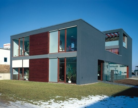 Obergeschoss sowie der Fensterelemente der Doppelfassade. Das Gebäude verfügt über außenliegenden Sonnenschutz auf den Süd- und Westseiten; im CAD-Bereich des Büros im EG ist der Sonnenschutz windgeschützt in der Doppelfassade integriert. Die wärmetechnische Versorgung des Gebäudes erfolgt über einen Gas-Brennwertkessel. Die Aufenthaltsbereiche verfügen über eine Fußbodenheizung. Über die nach Süden und Westen orientierten, durch äußeren Sonnenschutz regulierbaren Fassadenöffnungen ist ein kontrollierter winterlicher Wärmegewinn gegeben. Das Regenwasser wird in einer auf dem Grundstück vergrabenen Zisterne gesammelt und über mehrere Abnahmestellen zur Bewässerung der Außenanlagen genutzt.