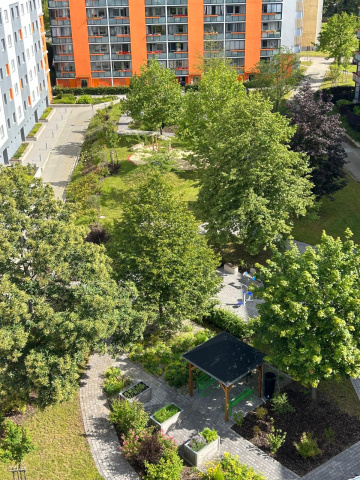 Der mittlere Teil des Innenhofes stellt den Bereich für Spiel, Sport und Aktivität dar. Hier wird für alle Altersklassen etwas geboten. Es gibt unterschiedliche Angebote für Outdoorfitness, wie zum Beispiel einen Crosstrainer. Die einzelnen Sportgeräte sind durch Strauchpflanzungen vom Hauptweg abgeschirmt. In Ergänzung zu diesen Freiraumelementen, welche eher für die Erwachsenen geeignet sind wird ein ‚Enkelspielplatz‘ in das Konzept integriert. Hier befinden sich eine kleine Spielanlage und ein Sandspielbereich und abenteuerlicher Hangrutsche. Mit Hilfe dieser vielseitigen Betätigungsmöglichkeiten wird eine hohe Aufenthaltsqualität für die gesamte Familie, von Großeltern bis zu den Enkelkindern implementiert.