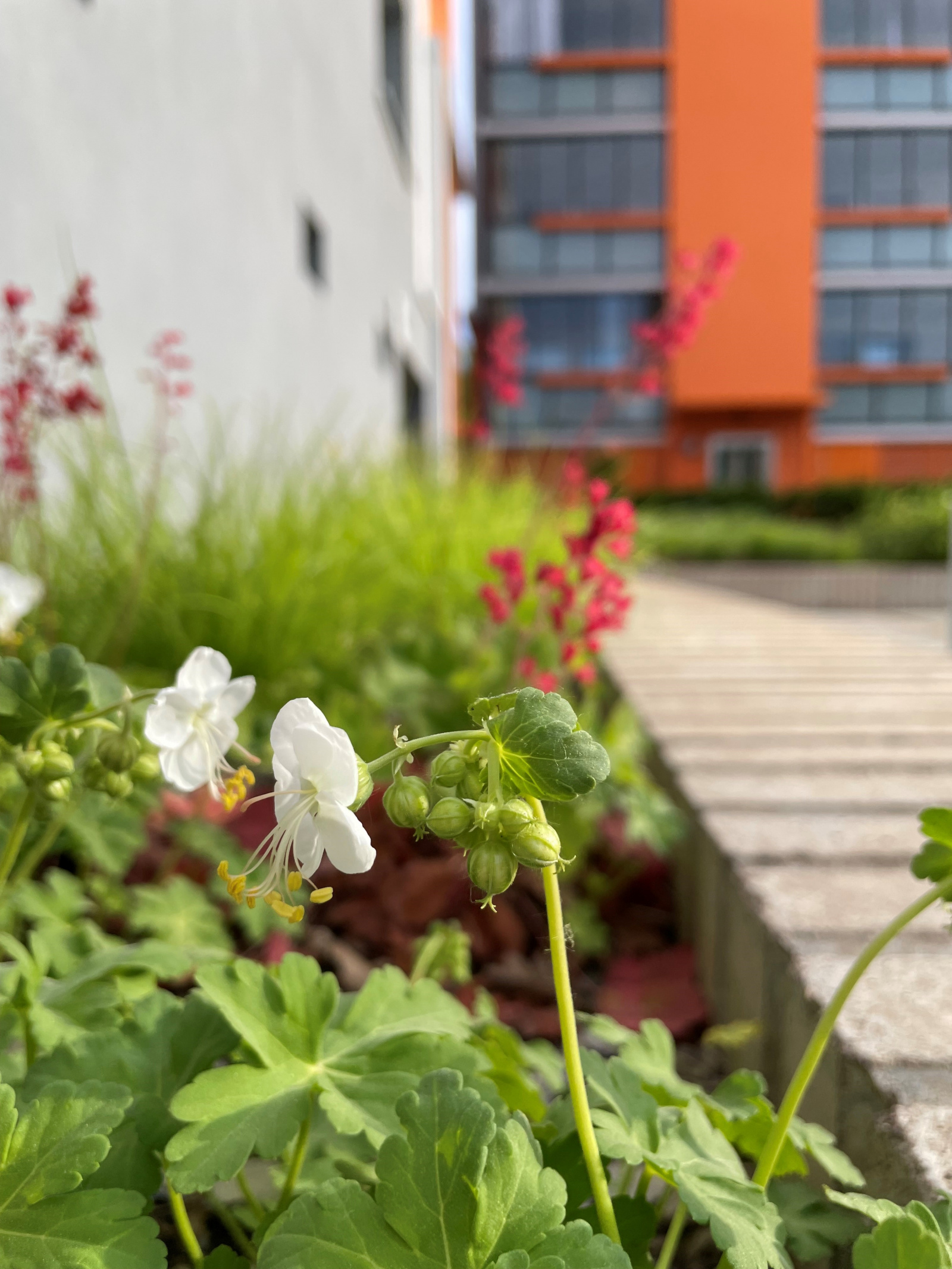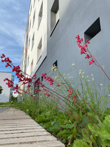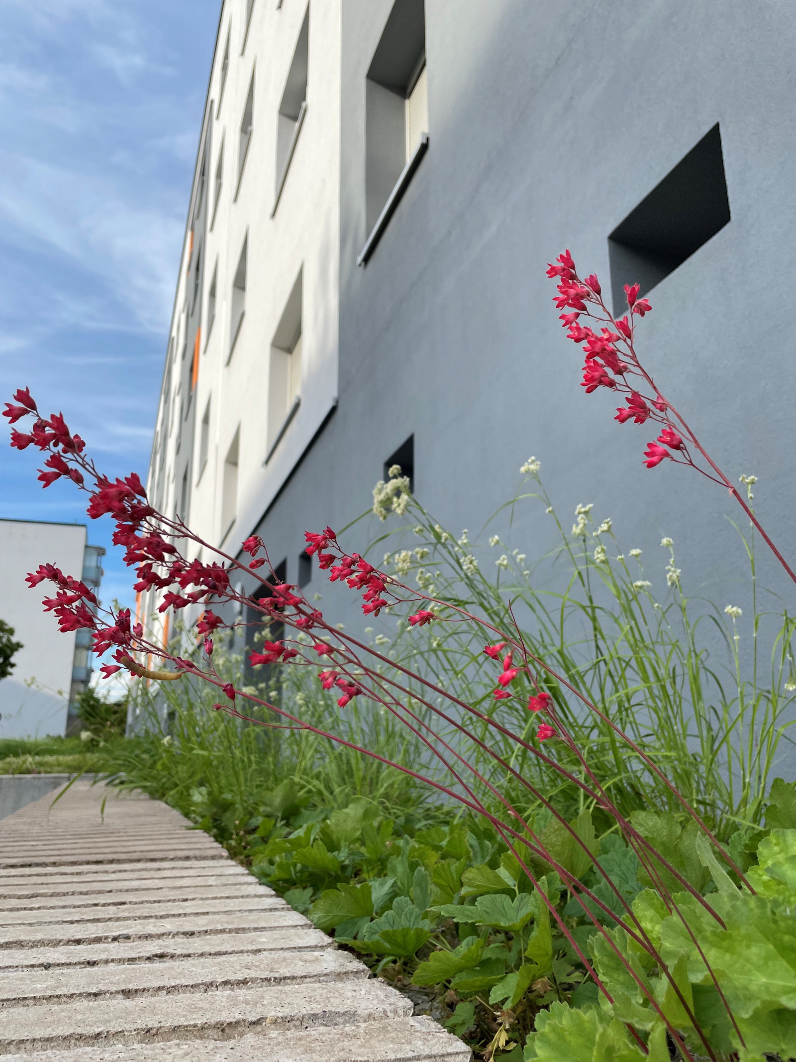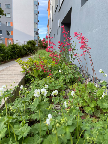 Im westlichen und nördlichen Bereich befindet sich der Innenhof auf einem höher gelegenen Plateau und wird durch eine mit bodendeckenden Stauden und Gehölzen bepflanzte Böschung von der angrenzenden Feuerwehrzufahrt abgegrenzt. Die befestigen Flächen an den Hauseingängen werden mit zierenden Staudenbeeten ausgestattet. In unmittelbarer Hausnähe entstehen sowohl bodengleiche als auch höher gelagerte, mit niedrigen Mauern eingefasste Pflanzflächen, welche je nach Standortansprüchen und Gestaltungsziel mit unterschiedlichen Pflanzen ausgestattet werden.
