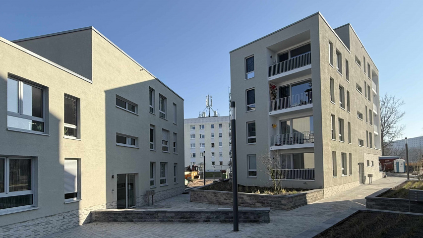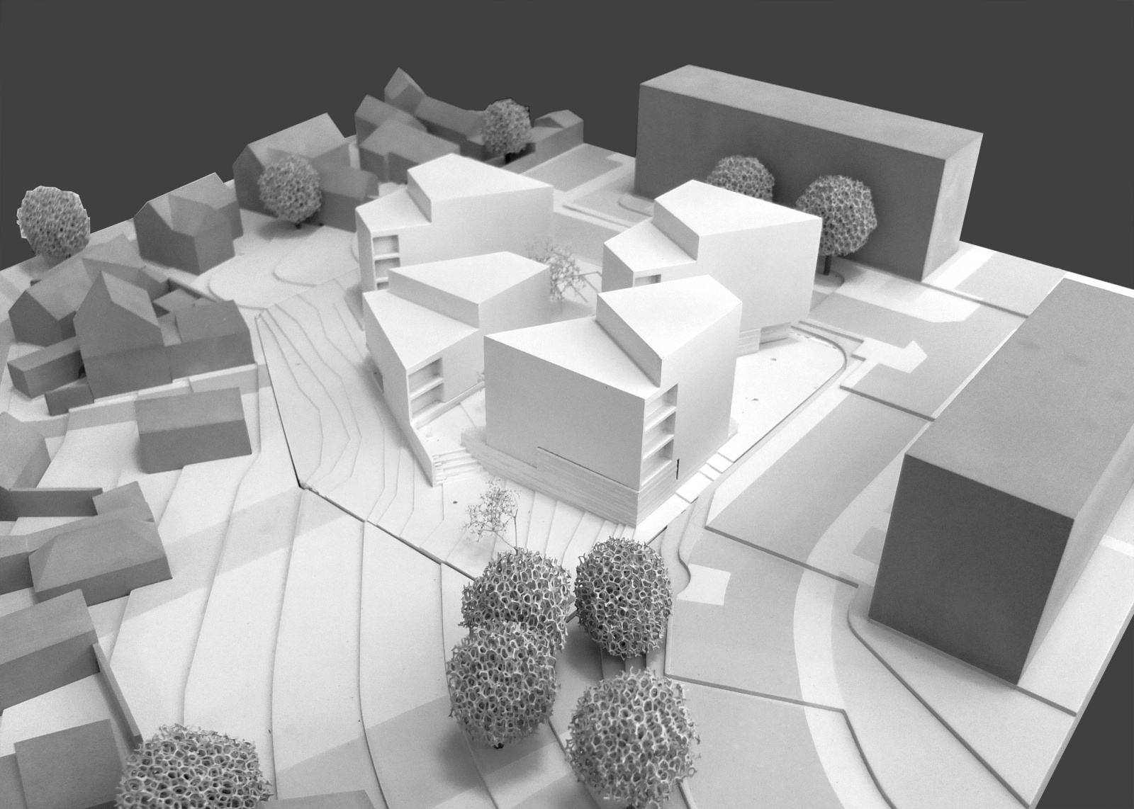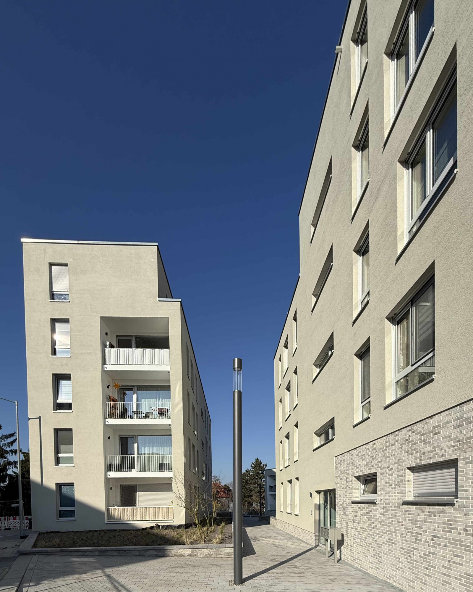 Insgesamt vier Gebäude mit 28 Wohnungen in einer offenen, durchlässigen Baustruktur ermöglichen visuelle und auch begehbare Verbindungen zwischen den angrenzenden Stadtquartieren. Gestalterisch verwandelte Kubaturen sowie die Reduktion auf wenige gestaltprägende Materialien sowie ein auf die Gesamtkonzeption abgestimmtes Freianlagenkonzept schaffen dabei einen qualitätsvollen, eigenständigen städtebaulichen Raum sowohl für die Nutzer als auch für die Öffentlichkeit.